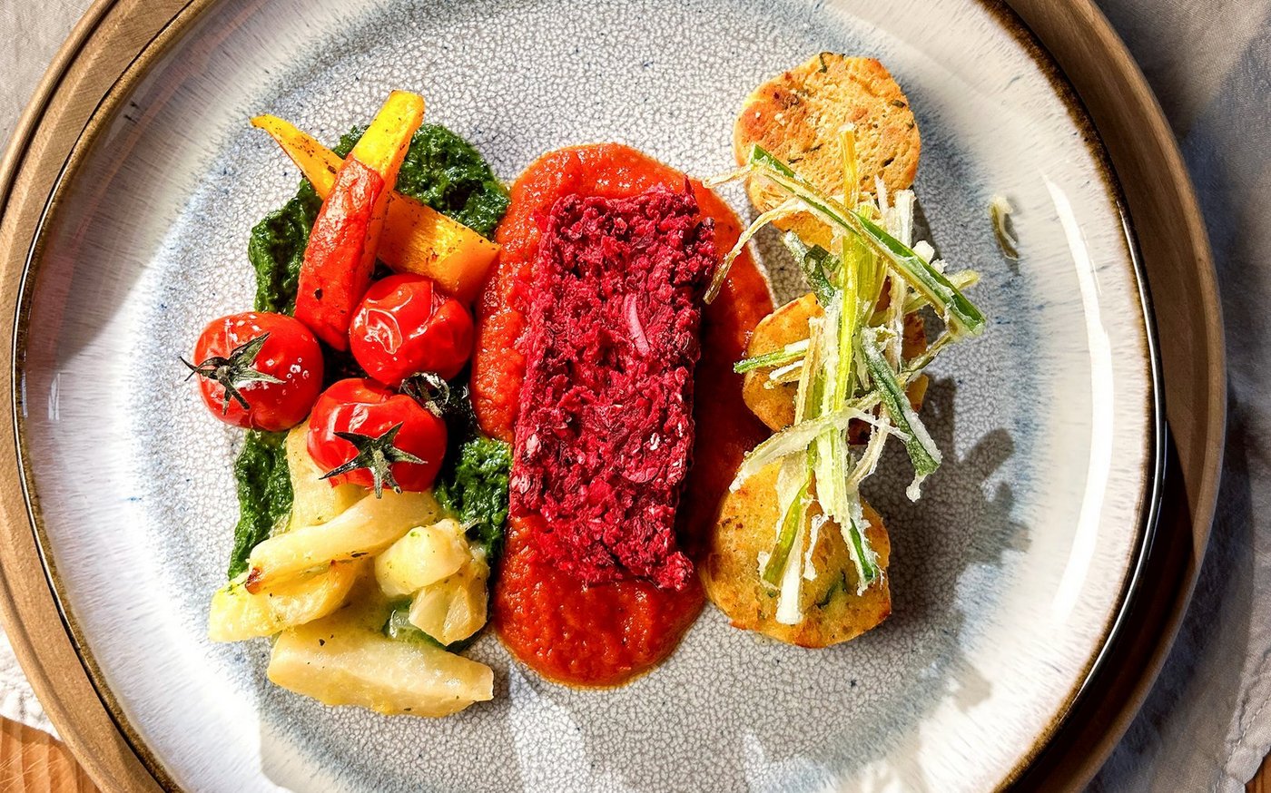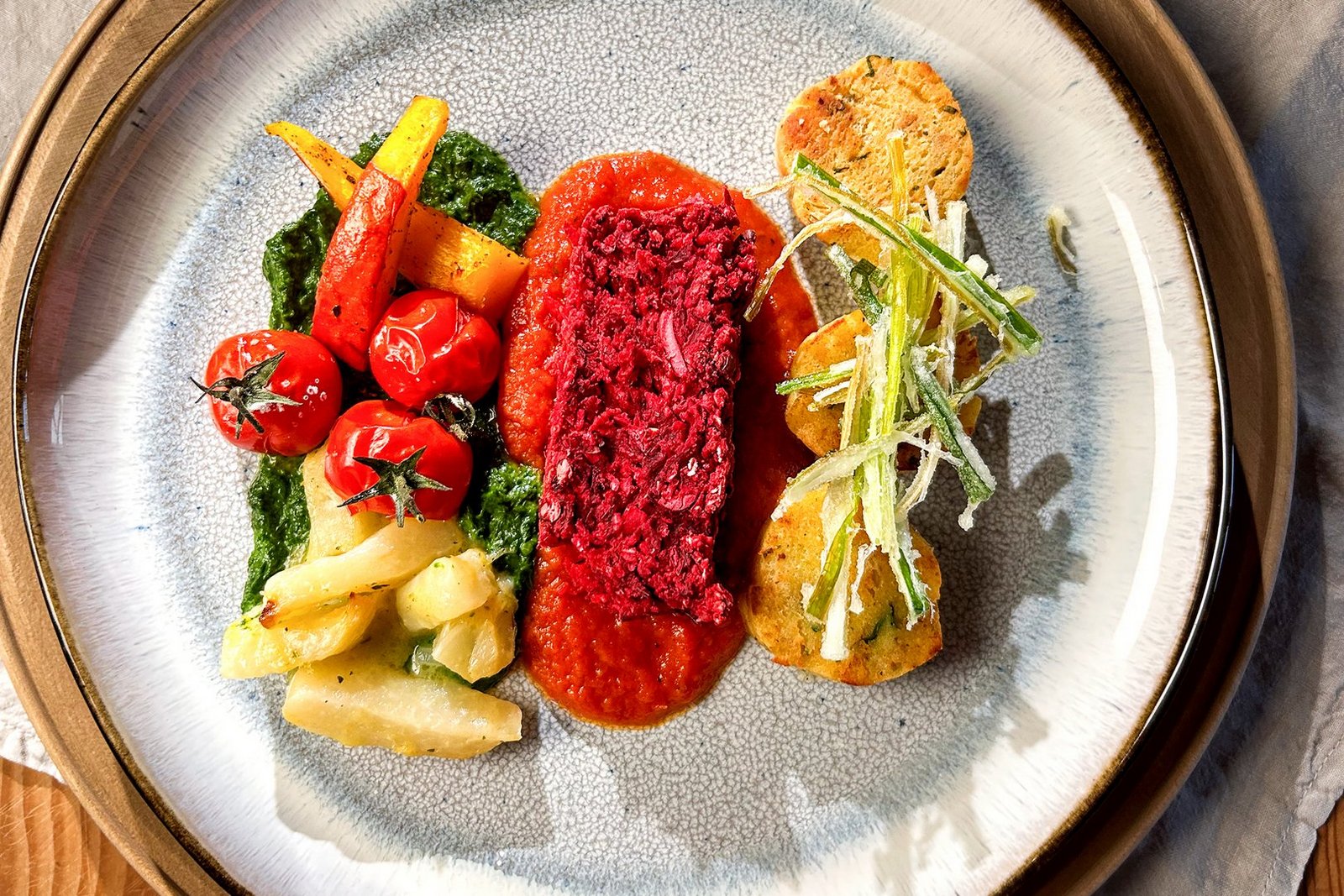 1 Tranche Hackbraten auf der Tomatensauce anrichten.