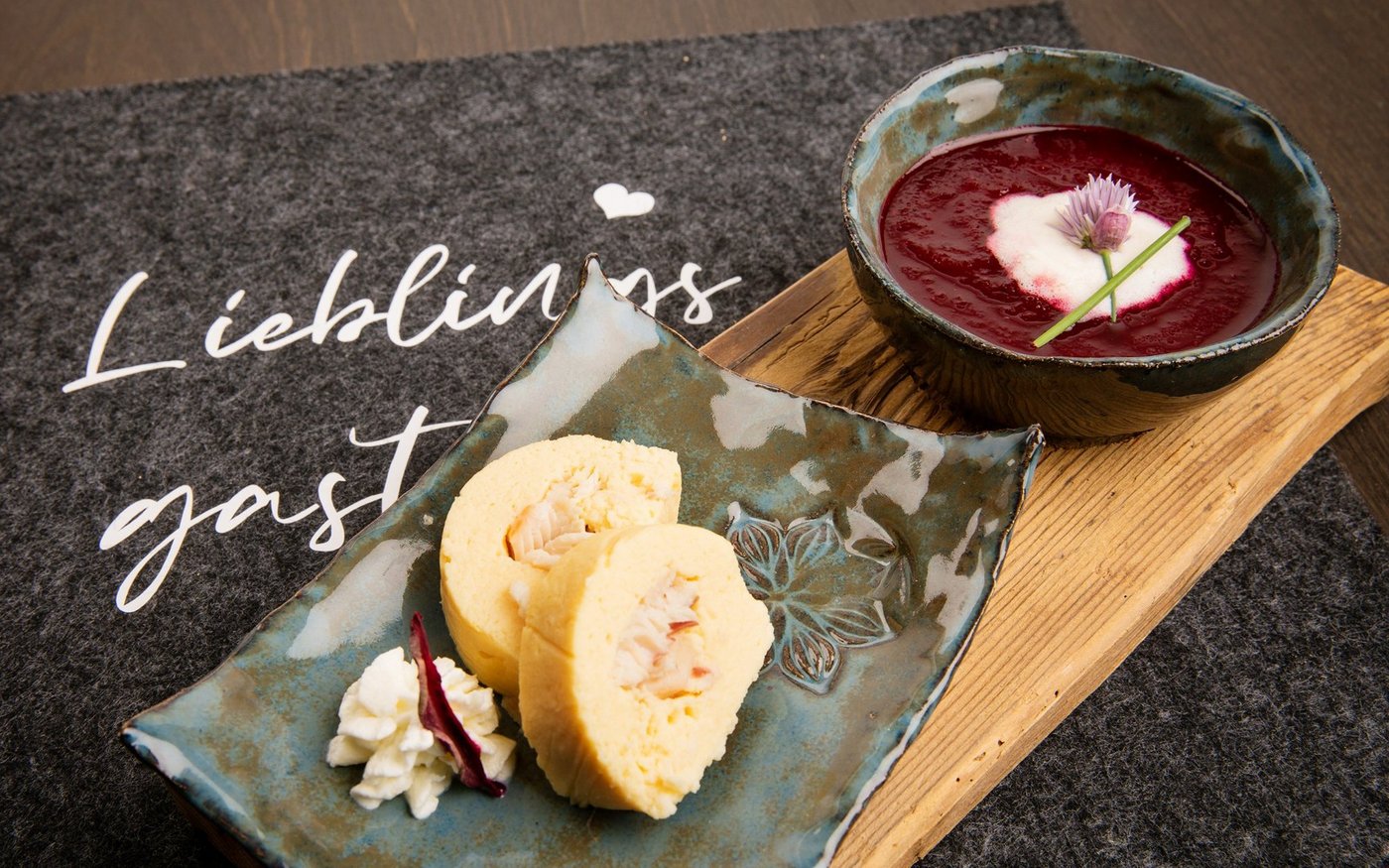 Randen-Meerrettich-Suppe in vorgewärmte Suppentassen oder -teller anrichten und mit einem Tupfer gewürztem Schlagrahm dekorieren. Sellerie-Meerrettich-Terrine auf ein Rüstbrett stürzen. Mit einem scharfen Messer in Tranchen schneiden. Je zwei Tranchen auf einem kleinen Vorspeiseplättchen anrichten. Mit einem Tupfer gewürztem Schlagrahm dekorieren und einem Stück Randen-Chips bestecken.
