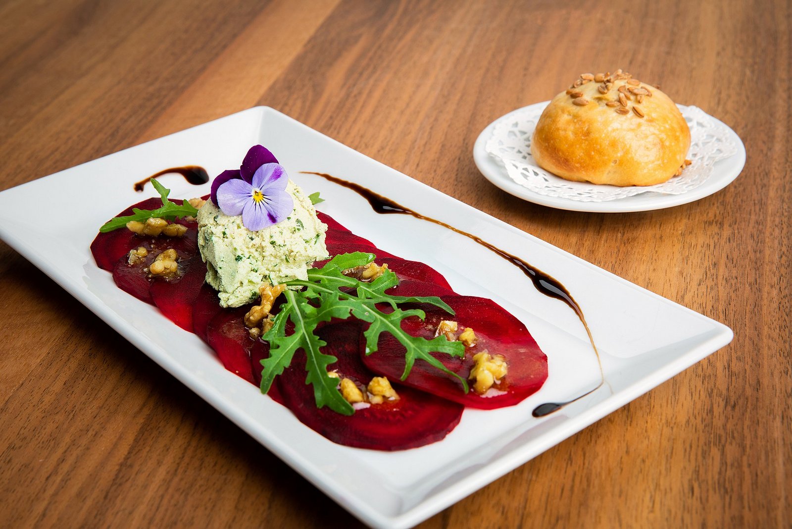 Randen-Scheiben in einer Längsreihe auf Vorspeiseteller anrichten. Ein paar Rucolablätter darauf anrichten. Eine Nocke Ricotta in der Mitte der Randen Linie anrichten. Randen mit Balsamico-Senf-Sauce nappieren und Baumnüssen bestreuen. Dinkel-Milchbrötchen separat dazu servieren, ausgeschmückt mit einem Stiefmütterchen.
