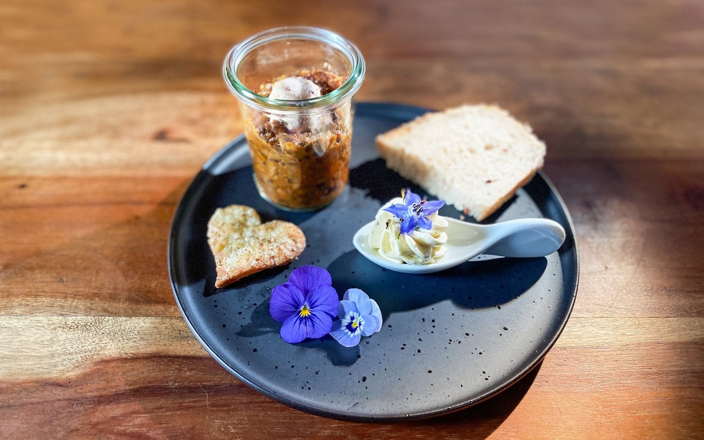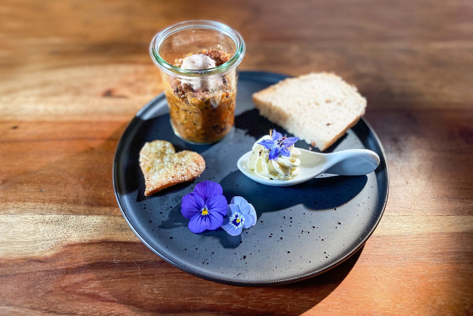 Linseneintopf in Gläser füllen. Je ein Glas auf den Vorspeiseteller stellen. Mit einer Philadelphia-Kugel belegen. Ein Stück Brot dazu legen. Eine Salz-Butter-Rosette dazu anrichten und mit Blüten garnieren. Ein Blätterteigherz dazu legen.