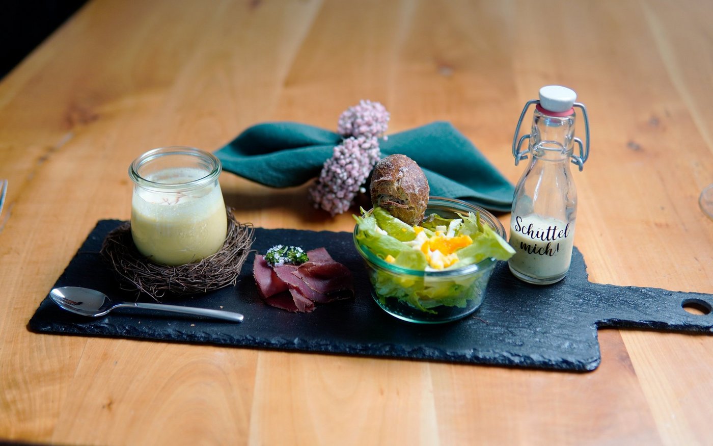 Eine Schieferlatte oder Vorspeiseteller bereitstellen. Süppchen in Gläsli abfüllen, mit Rahmtupfer, Safranfäden und Petersilie dekorieren. Blattsalat in Schüsseli abfüllen, mit Eischeiben und Blütenblättern ausgarnieren. Brötli mit einem Brotmesser einschneiden und auf Schüsselirand aufstecken, Salatsauce in kleine Fläschchen abfüllen und dazustellen. Trockenfleisch dazu legen.