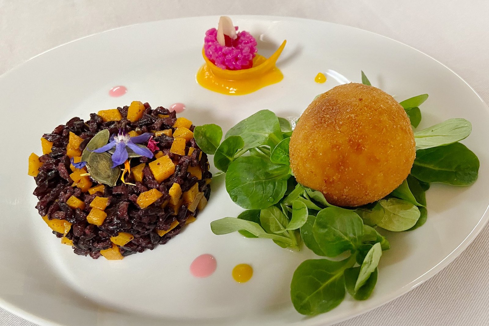 Gemüsebouillon 4,5dl Wasser halbe Karotte halbe Zwiebel Kräuter wie Petersilie, Rosmarin, Maggikraut, je nach Geschmack 1 Prise Salz Wasser in eine Pfanne geben, Gemüse und Kräuter zugeben. Zum Kochen bringen, Pfanne von der Herdplatte nehmen und 20 Min. zugedeckt ziehen lassen. Ein Sieb auf ein Litermass legen und die Gemüsebouillon absieben. Salz zugeben und bereitstellen.[REL 1] Arancini 1 EL Rapsöl…