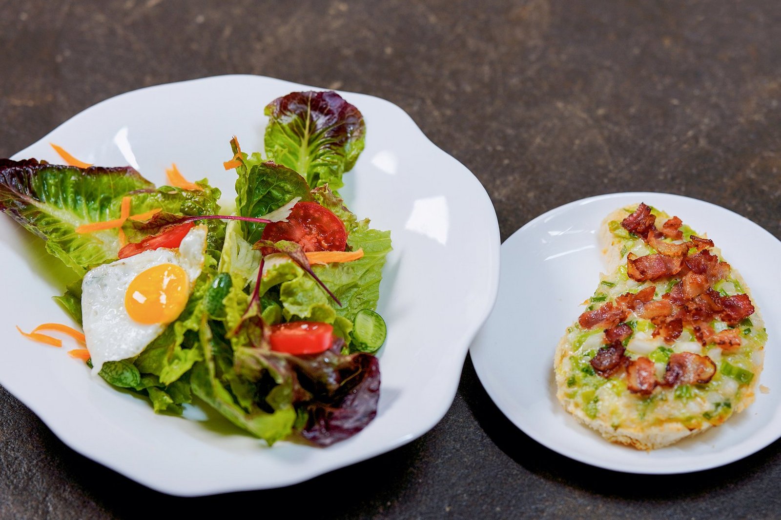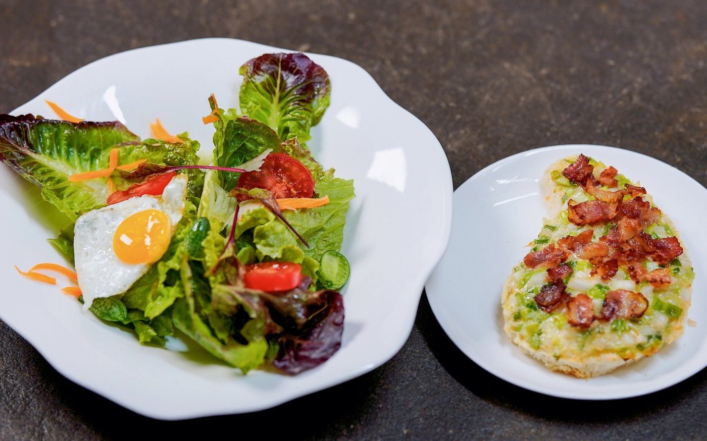 Kurz vor dem Servieren 3-4 Esslöffel Zigersalatsauce über den Blattsalat verteilen, leicht mischen und auf Salatteller anrichten. Mit Rüebli-Streifen und Kohlrabi-Streifen bestreuen. Cherrytomaten-Hälften dazu legen und mit einem warmen Wachtel-Spiegelei belegen.