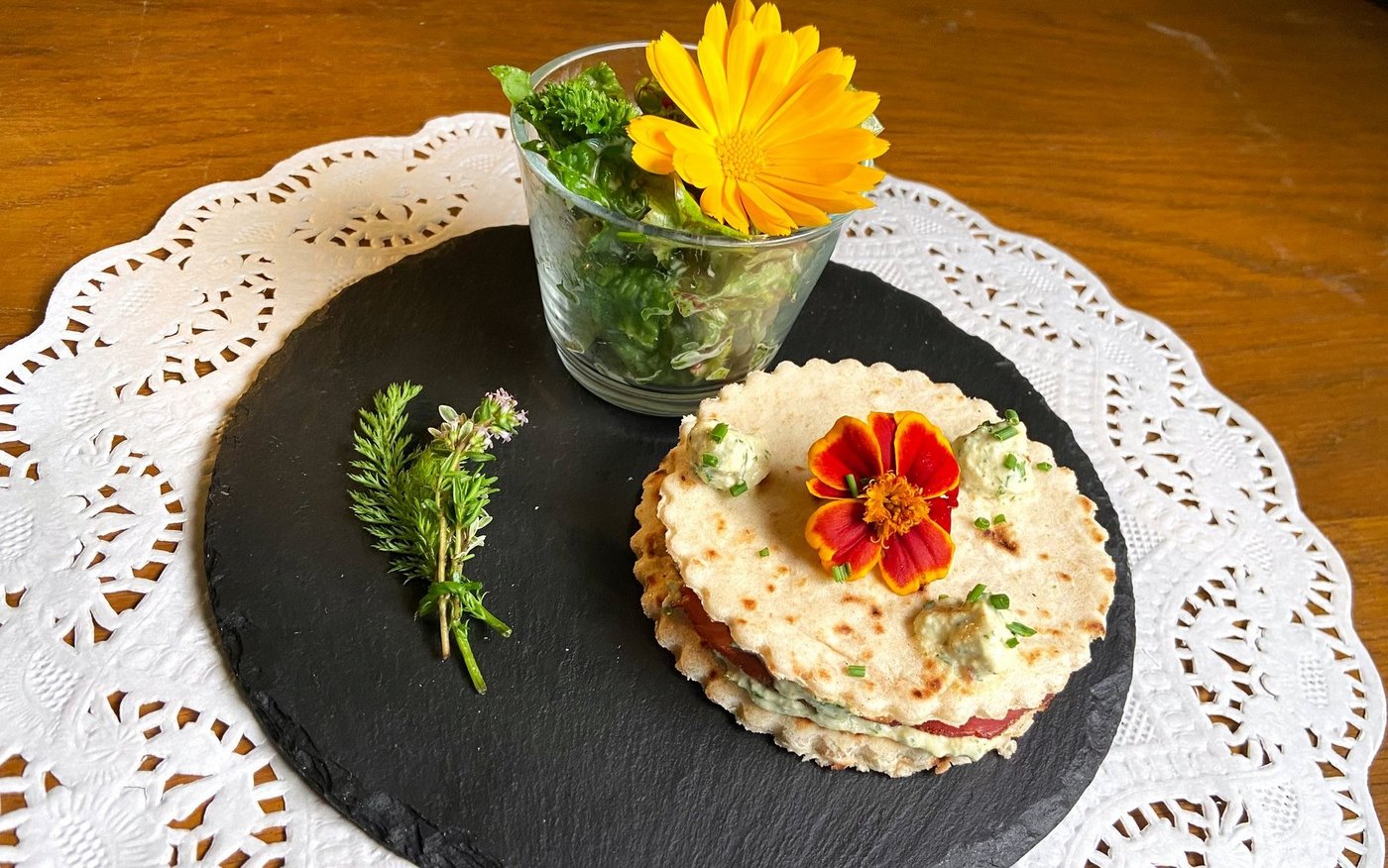 Je ein «Iklemmts» auf Vorspeiseteller anrichten. Salat dazu anrichten.