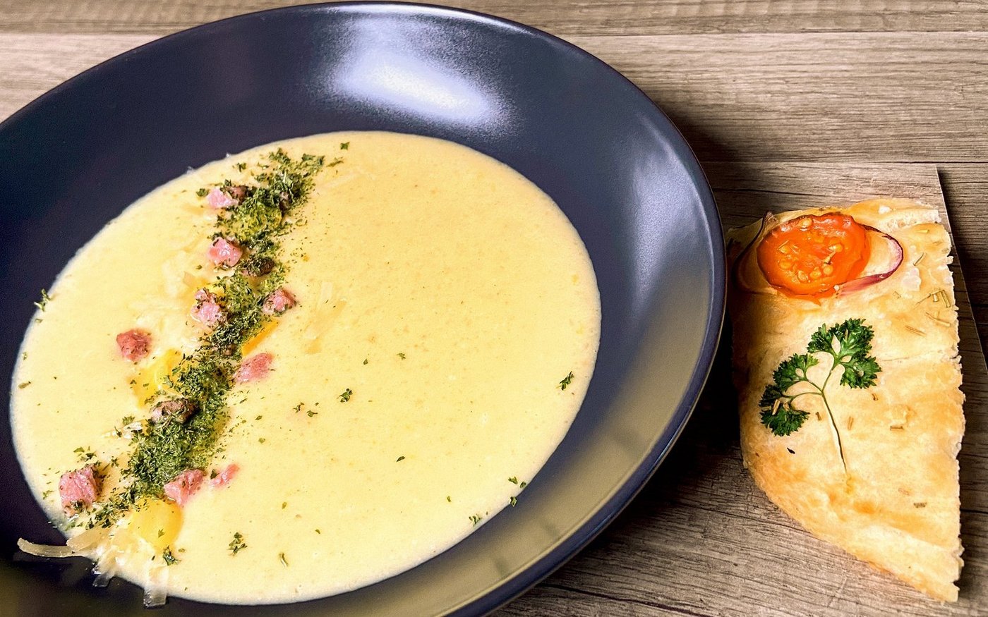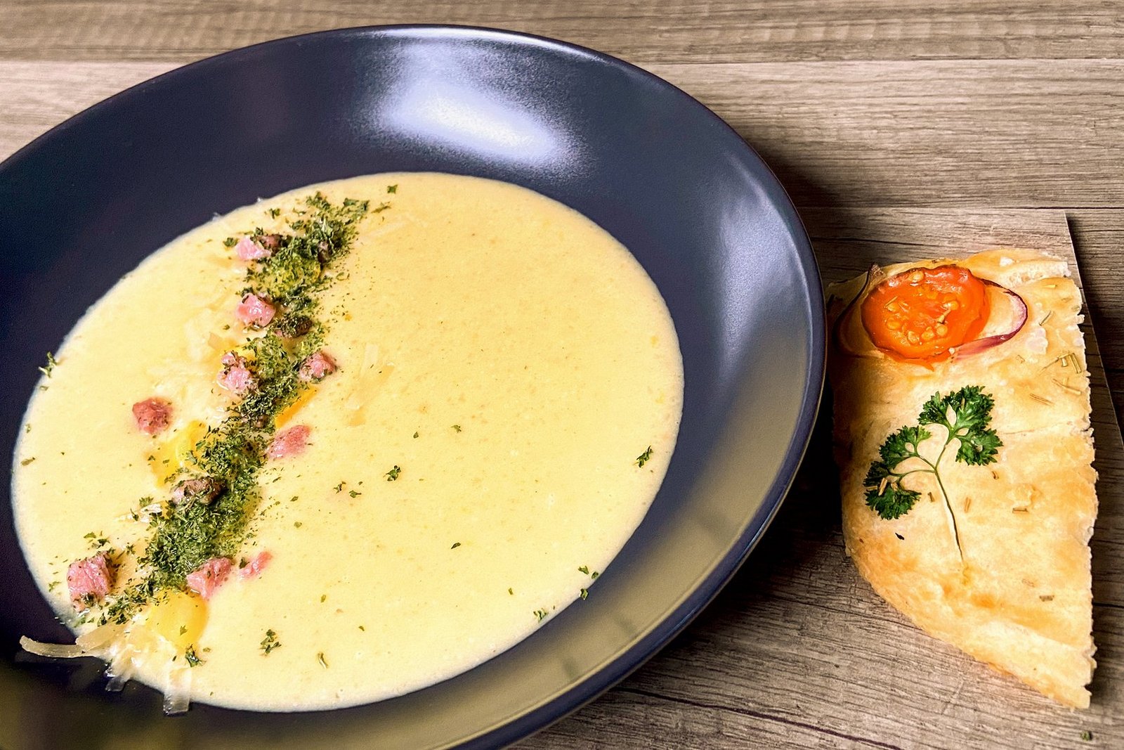 Zucchettisuppe in vorgewärmte Teller schöpfen. Mit der Petersilie seitlich eine Linie ziehen, diese mit Zucchettiwürfeli, Käsespänen und Speckwürfeln oder Rotwein-Zucchetti belegen. Suppenteller auf ein Brett oder einen Unterteller stellen. Focaccia in Stücke schneiden, sodass eine Blume zu sehen ist, und neben dem Suppenteller anrichten.