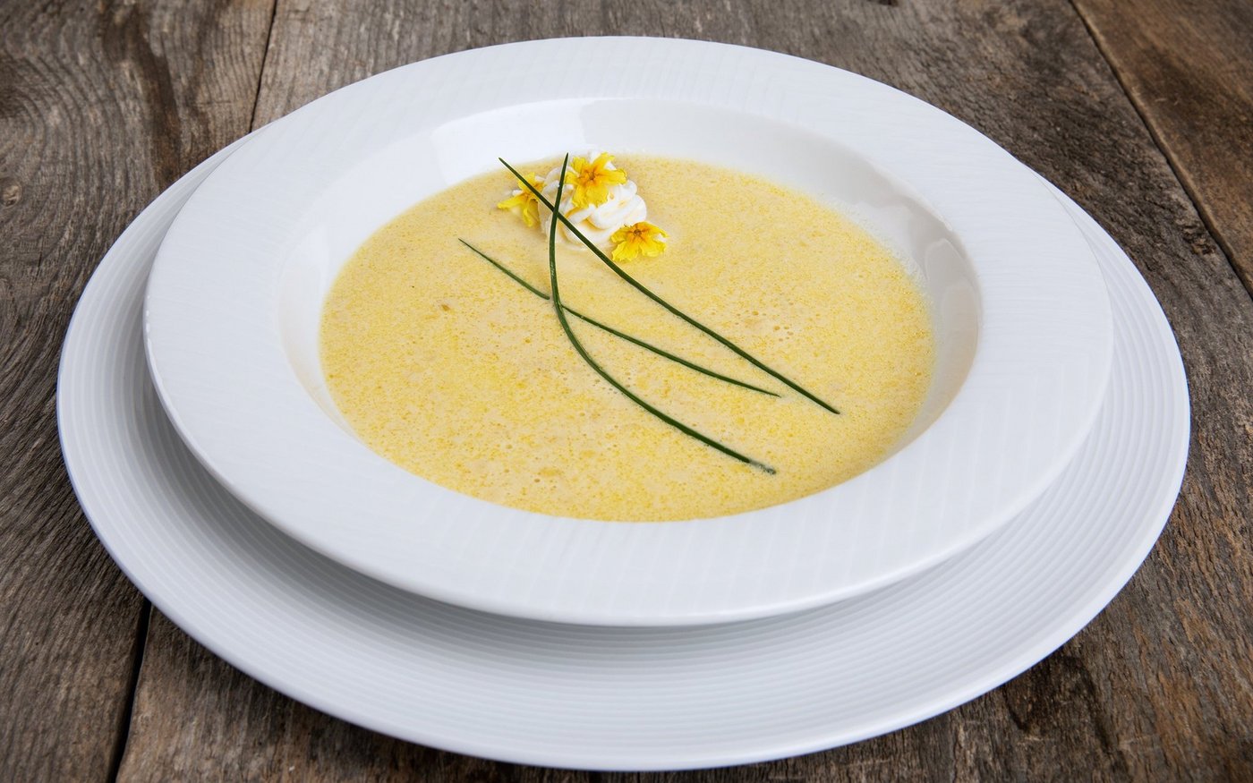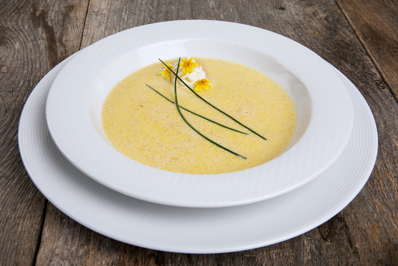 Die Schlüsselblumensuppe in vorgewärmte Suppenteller anrichten und mit Schlagrahm, Schlüsselblumen-Blüten und Schnittlauch ausgarnieren.