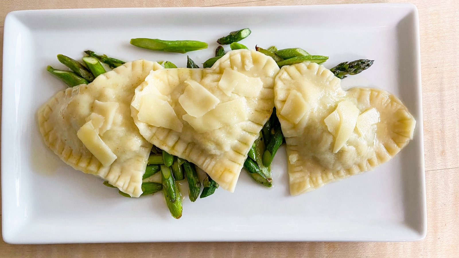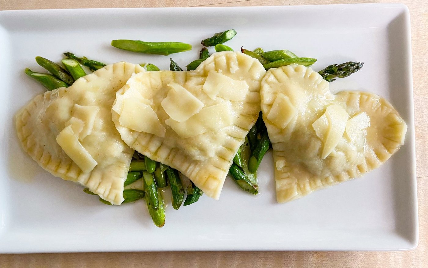 - Rapsöl in einer beschichteten Bratpfanne erhitzen. Die Spargelstreifen zugeben und kurz anbraten Mit Salz und Pfeffer würzen. Über die Ravioli wird noch etwas Alpkäse gelegt, der in ganz dünne Streifen gehobelt ist. Die Ravioli vor dem Servieren kurz in der heisser Butter schwenken.
