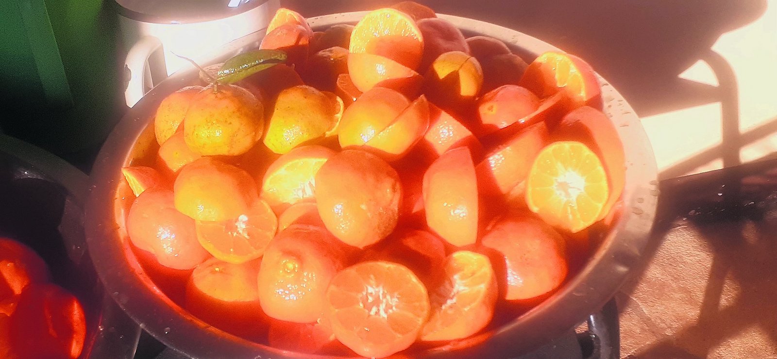 Dieses Jahr waren die Bäume voll mit Mandarinen und die Äste hingen bis zum Boden. Es ist erfreulich, jeden Tag direkt von den Bäumen frische Mandarinen essen zu können und das über drei Monate hinweg. Wir bereiteten zu Hause phantasiereiche Gerichte mit den orangen Früchten für uns zu. Da gab es Mandarinen zusammen mit Erdnüssen, Mandarinensaft, -gelee, -konfi, -torte, und -quark. Oder getrocknete Mandarinen in einem «Znünibrot» anstatt einer Aprikose.