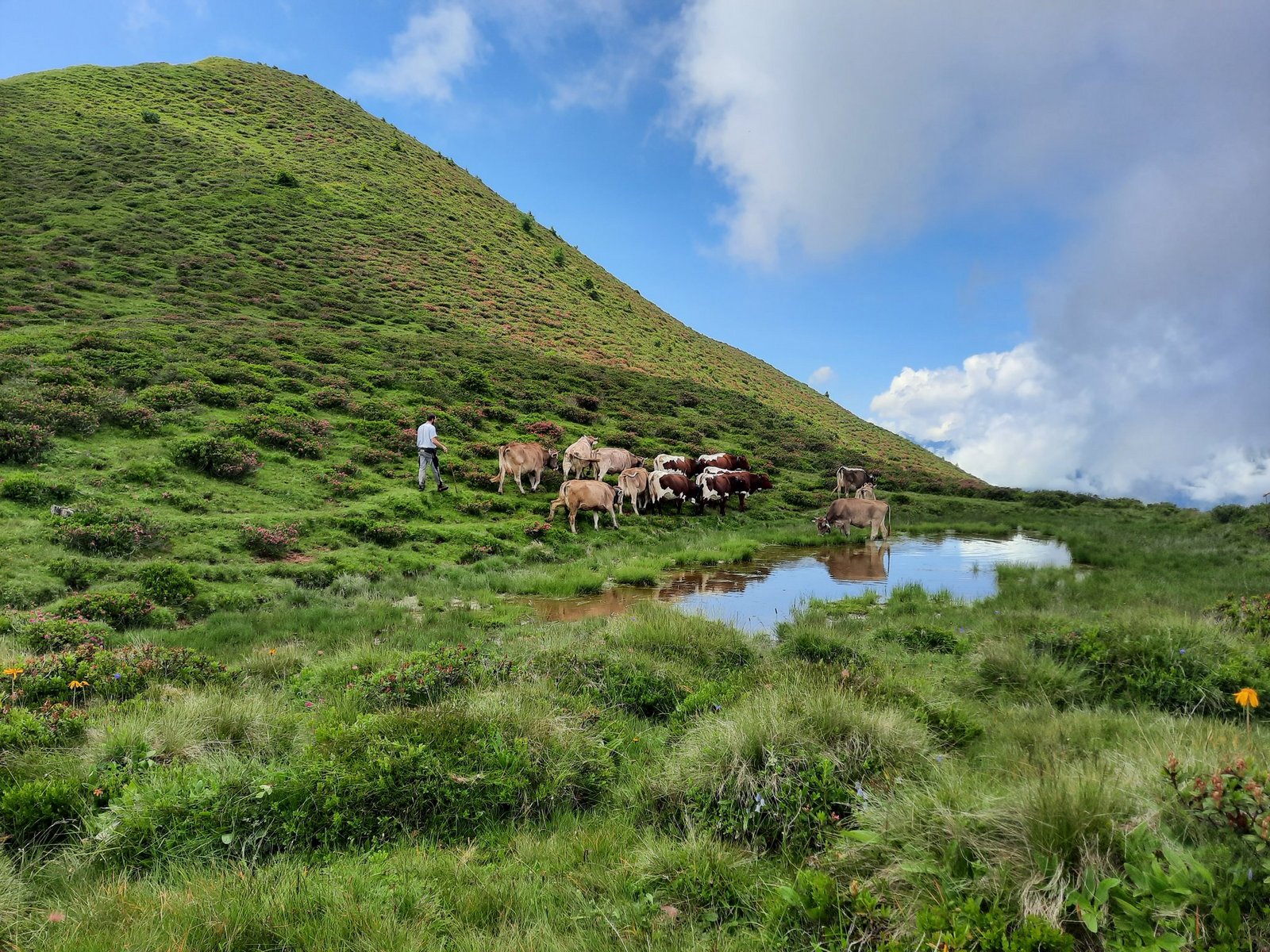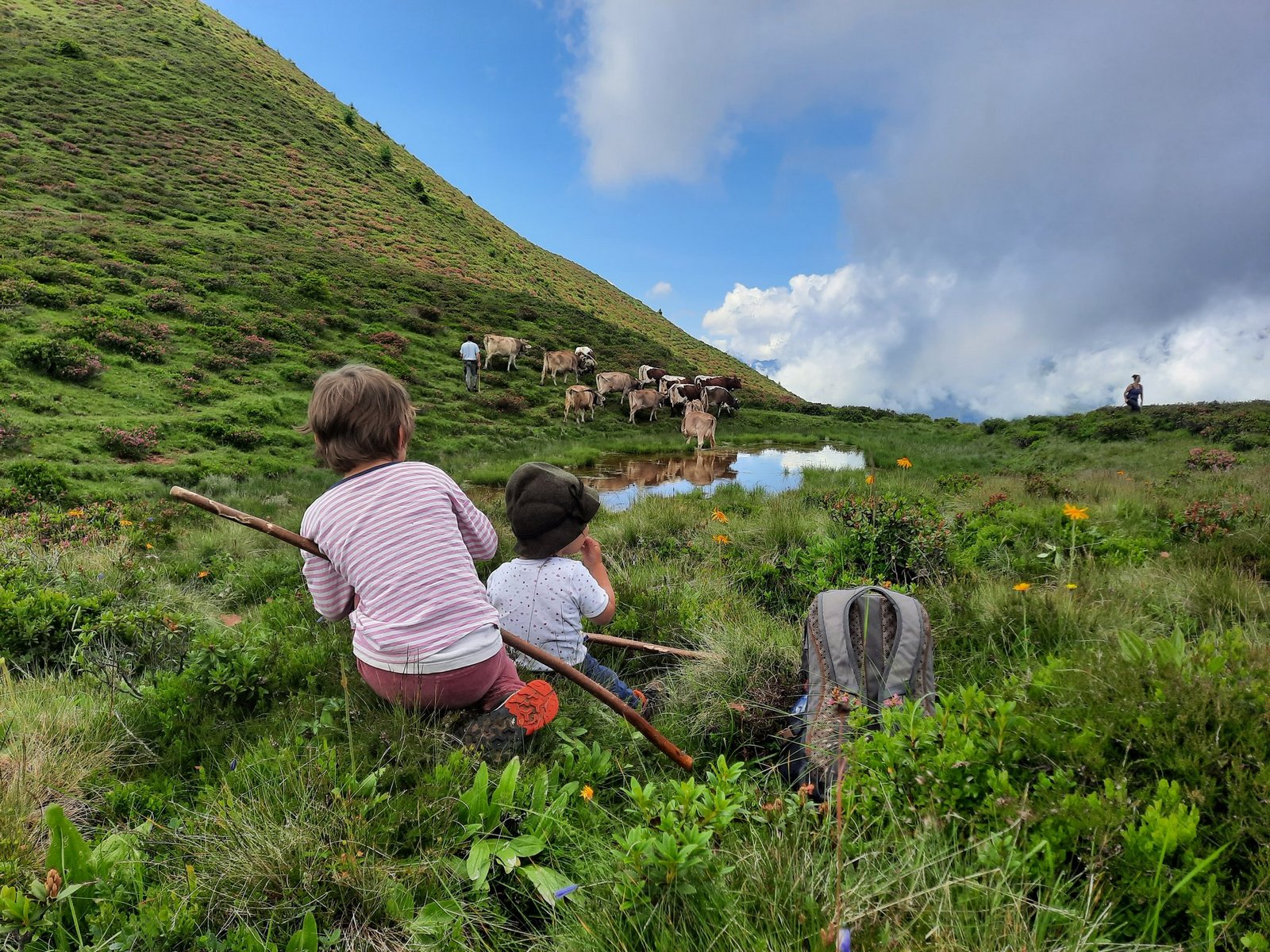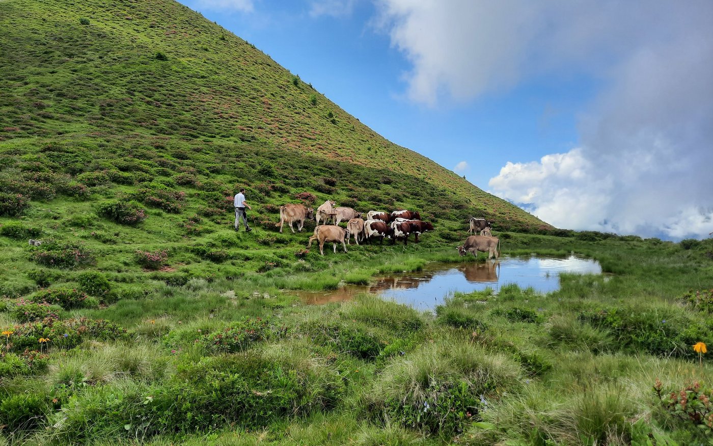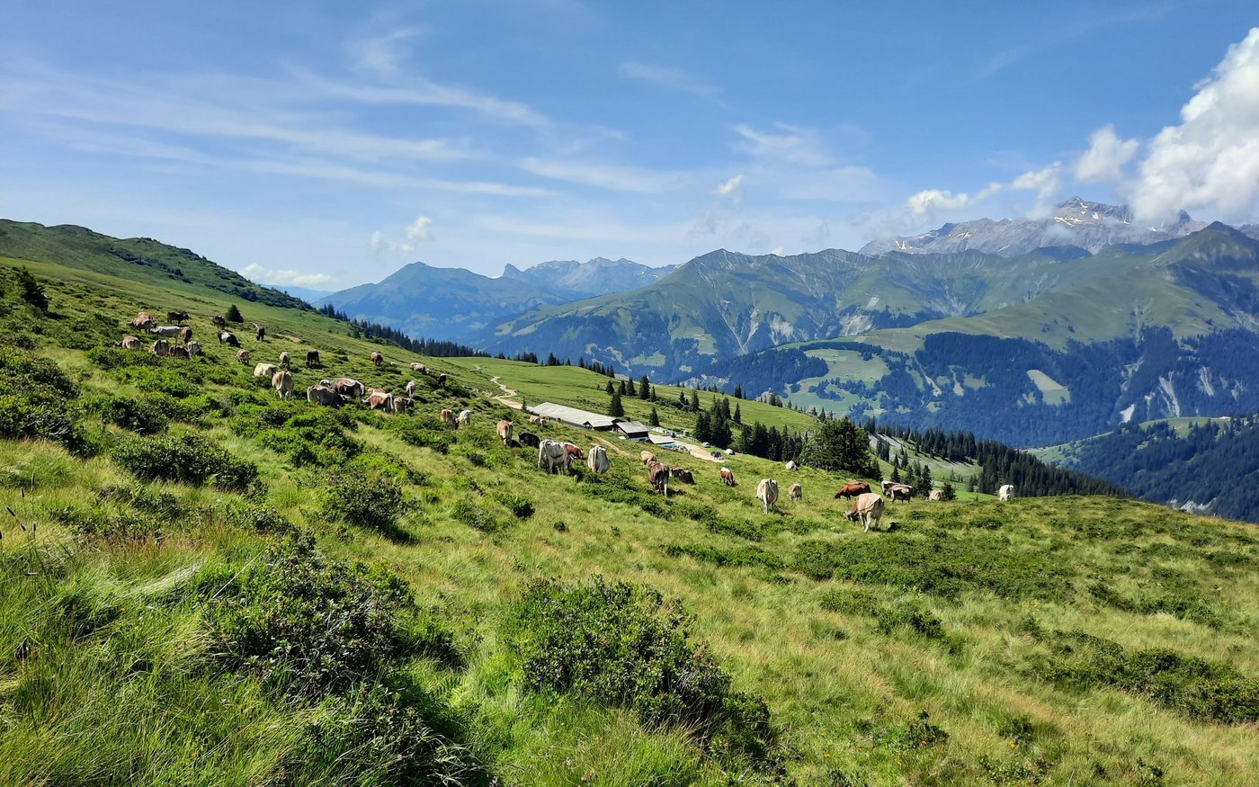 Endlich richtig Sommer! Blicken wir ins Tal, sehen wir, wie überall fleissig gemäht wird. Mit unseren Kühen sind wir nun auf den obersten Weiden vom «Chrüz» auf 2195 Meter über Meer. Damit sie nicht bei zu heissem Wetter die 300 Höhenmeter erklimmen müssen, beginnt unser Hirtenteam bereits morgens um halb drei mit Einstallen. Zu zweit werden nach dem Melken die Kühe auf die saftigen Weiden getrieben. [IMG 2] Nachmi…