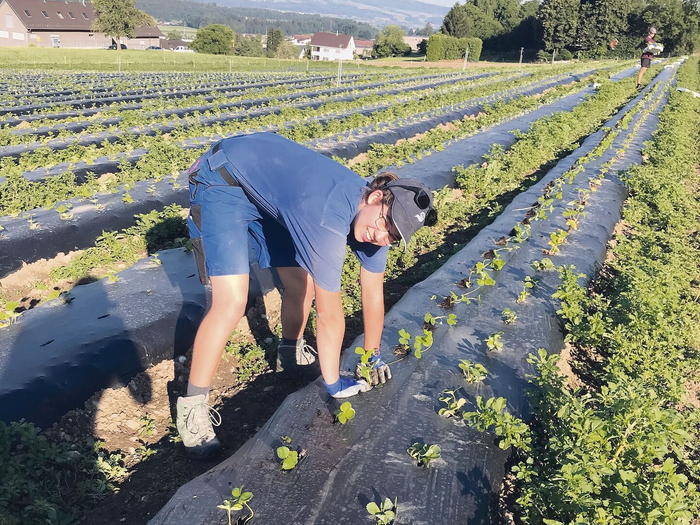 Es gab gleich zu Beginn alle Hände voll zu tun: Arbeit im Stall, auf dem Feld und in der Obstanlage, daneben der zweite Schnitt Ökoheu. Die Hauptarbeit in der ersten Woche war jedoch eher speziell: Mit Hilfe von fleissigen Helfern aus dem Bekanntenkreis setzten wir rund 34 000 Erdbeersetzlinge, welche im nächsten Juni zum Selberpflücken angeboten werden. Gesetzt haben wir während zwei Tagen alle Setzlinge von Hand in vorgelochte Dämme. Das war sehranstrengend, aber es hat mir trotzdem gut gefallen.