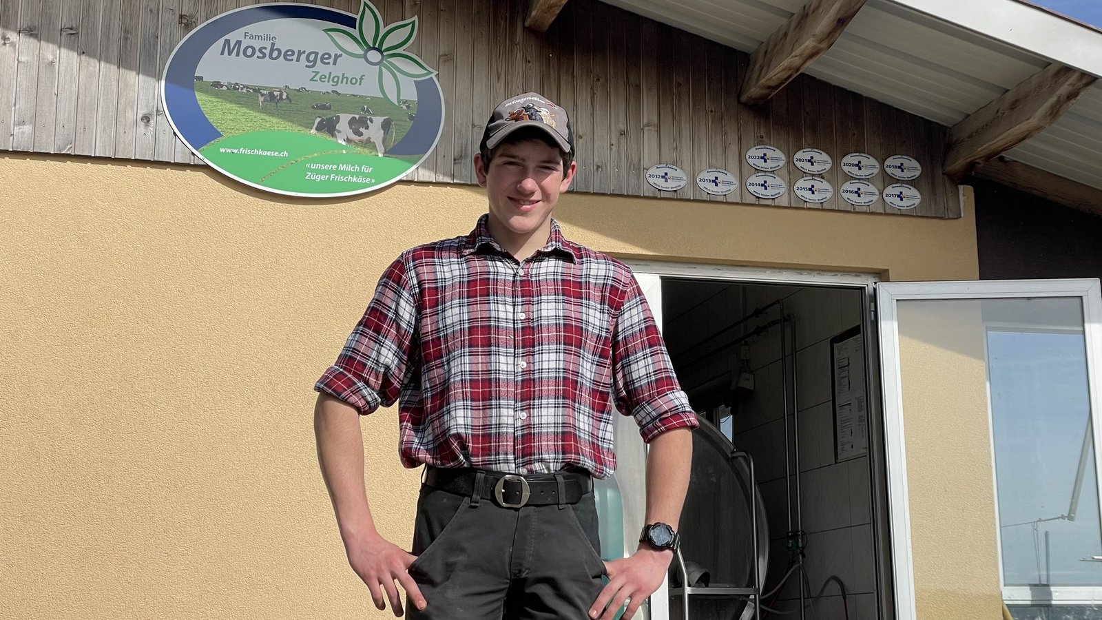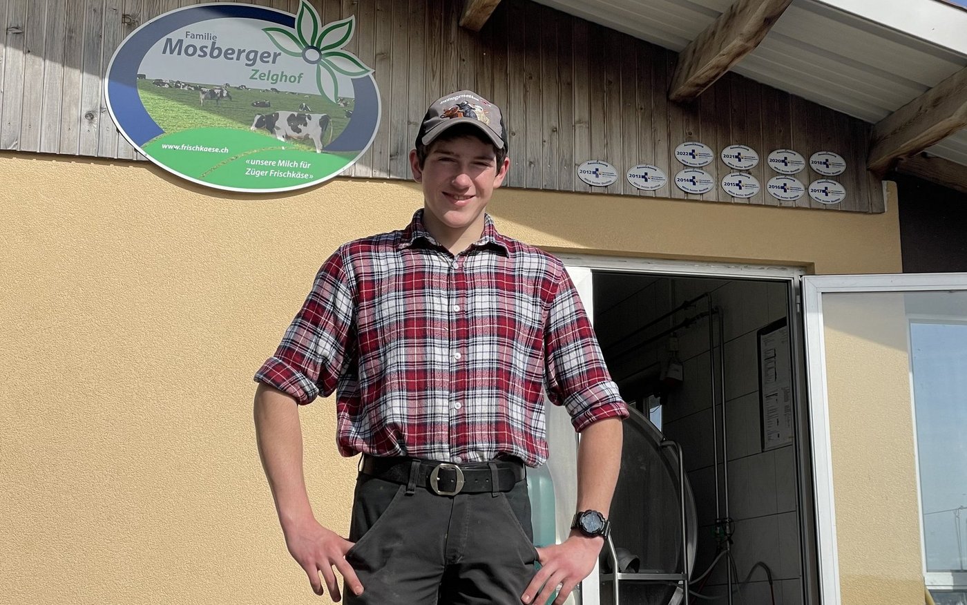 Die Diversität an Aufgaben und Tieren auf dem Zelghof war der Grund, weshalb sich der angehende Landwirt für diesen Lehrbetrieb entschieden hat. Die Besitzer-Familie Mosberger bewirtschaftet 30 Hektaren Land im Umkreis von 5 Kilometern. Neben Natur- und Kunstwiesen stellen sie auch ihren eigenen Silomais für die Kühe her. Fünf Hauskatzen, fünf Legehennen und sechs Bienenvölker gehören ebenfalls zum Hof. «Aus unserer Milch wird Züger Frischkäse hergestellt», erzählt der 17-Jährige, «unsere Kühe geben im Schnitt 10'000 Liter Milch pro Laktation.» Sein Lehrmeister Fredi Mosberger unterstützt ihn bei seinem Vorhaben, «Lehrling des Jahres 2024» zu werden. Seit über 25 Jahren bilden Fredi und seine Frau Monica Mosberger Lehrlinge aus. «Erst nachdem Simon es unter die 10 Finalistinnen und Finalisten geschafft hatte, hat er uns von seiner Bewerbung erzählt», sagt Fredi Mosberger am Mittagstisch. Er habe sein Bewerbungsvideo ohne Hilfe über zwei Wochen verteilt aufgenommen, erklärt Simon Broger stolz. «Ich habe das Video auch selbst geschnitten, bearbeitet und passende Musik hinzugefügt.»