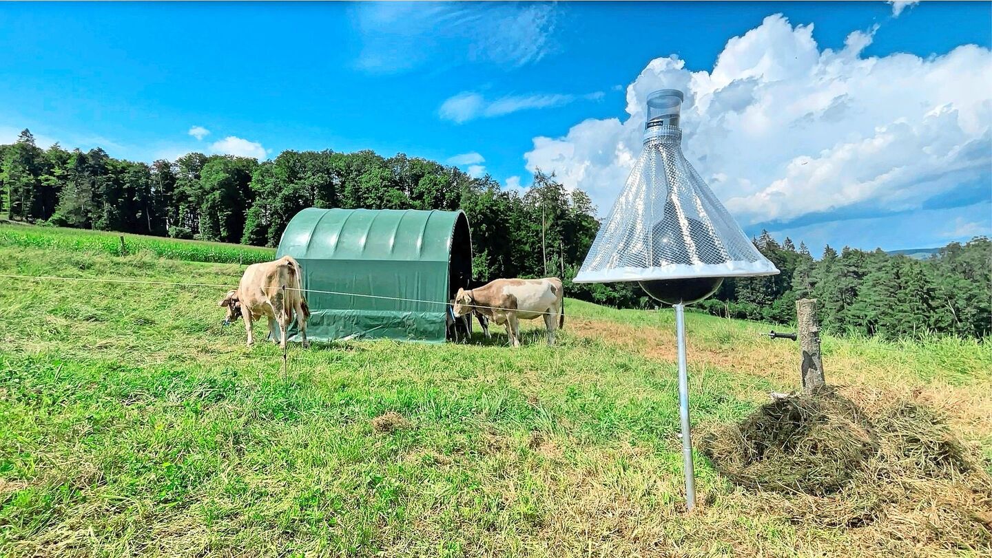 Gegen die Fliegen, Bremsen und anderes Ungeziefer haben wir die Rinder bisher mit einem Mittel eingesprüht. Zusätzlich haben wir diesen Sommer eine Bremsenfalle aufgestellt. Das Prinzip ist einfach: Ein grosser schwarzer Ball wird an einem Eisengestell aufgehängt und dient als Lockball. Darüber befindet sich ein Trichter, der viel Wärme durchlässt, wodurch der Ball darunter erhitzt wird. Ganz oben ist ein kleiner Behälter, gefüllt mit Seifenwasser.