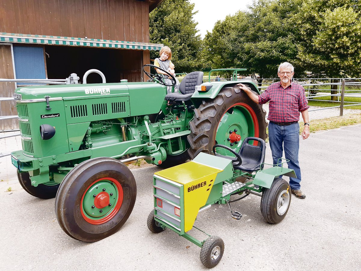 Einen schönen Anblick bieten sie, die beiden Bührer von Willi Lüthi-Guldimann aus Halten SO. Beim grossen Oldtimer handelt es sich um einen Bührer OP17 mit Baujahr 1971. Sein vierzylindriger Perkins-Motor verleiht dem grünen Schweizer Klassiker 55 PS; das Modell verfügt über ein 15-Gang-Getriebe. Zwischen 1969 und 1975 fertigte die Traktorenfabrik Bührer in Hinwil insgesamt 917 Stück des Typs OP17. Lüthi-Guldimanns…