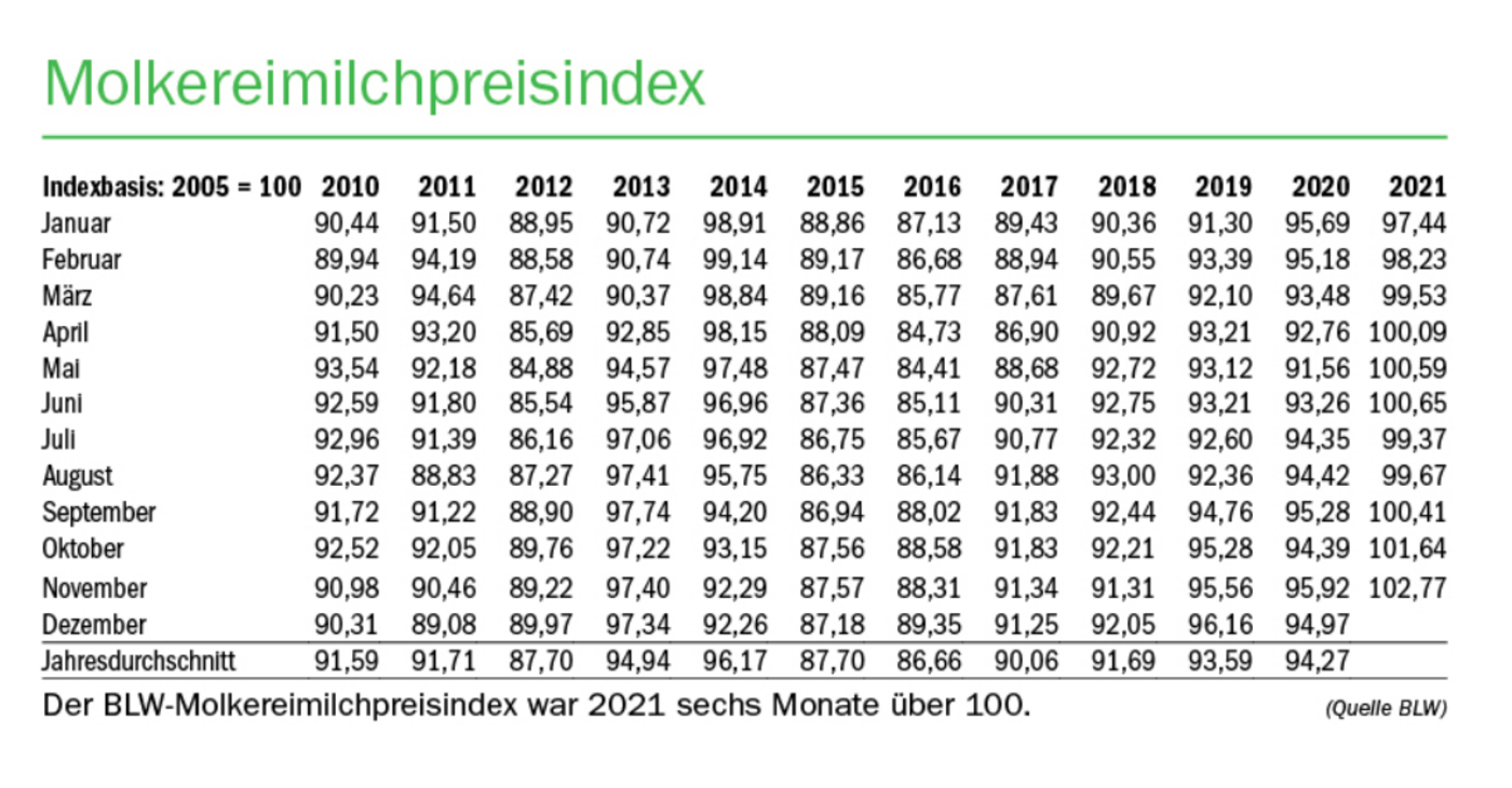 Seit einiger Zeit entwickelt sich der Milchmarkt in der Schweiz positiv. Vor dem Hintergrund stagnierender Milchmengen und guten Absatzzahlen konnten die Molkereimilchpreise ab Hof für Januar bis November 2021 gegenüber dem Vorjahr um 3,8 Rp./kg, diejenigen der Käsereimilch um 2,63 Rp./kg gesteigert werden. Doch wie kann jetzt festgestellt werden, ob die aktuell beobachteten Marktpreise und -entwicklungen eine…