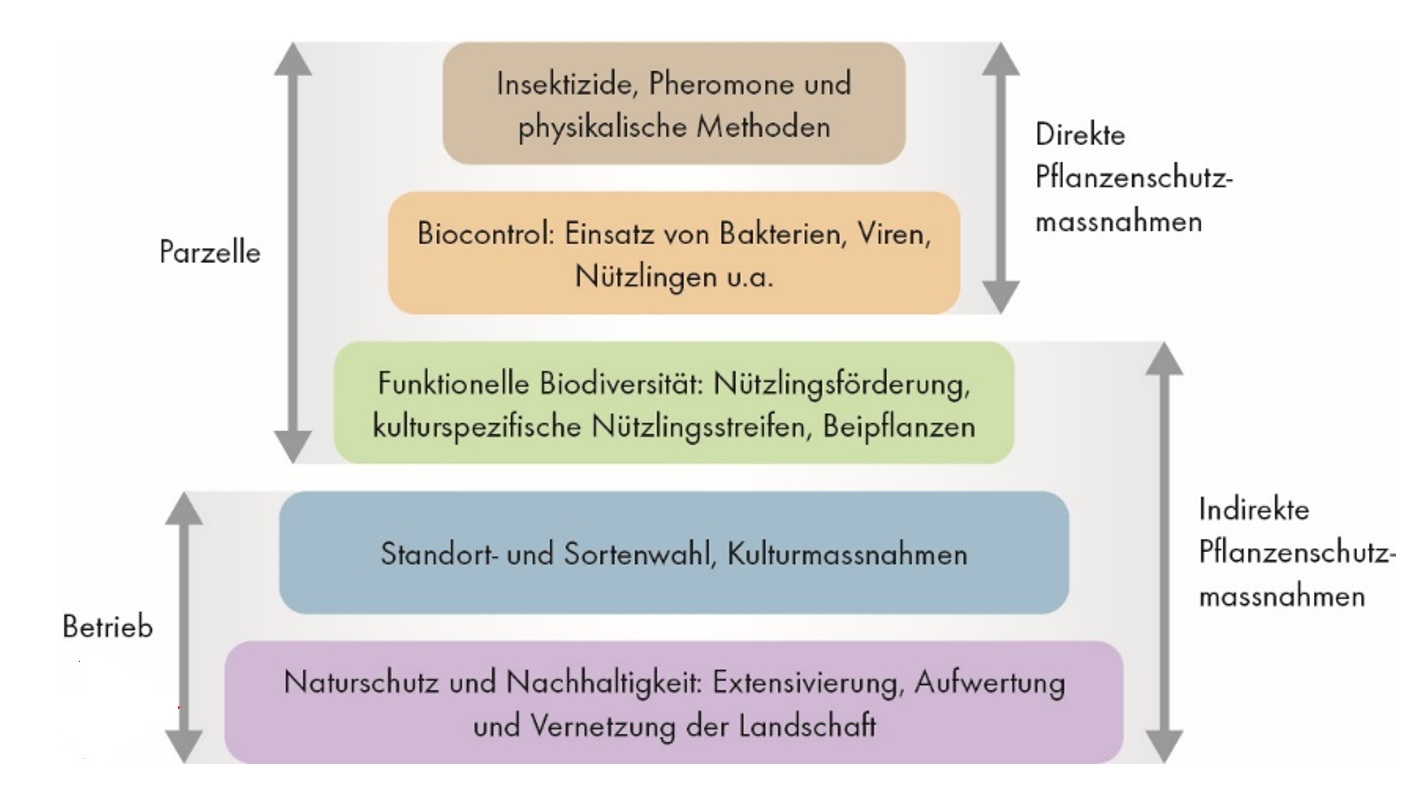 "Biologischer Pflanzenschutz ist mehr als der Ersatz von chemisch-synthetischen PSM. Es gilt den Pflanzenschutz umfassend zu verstehen. Der Pflanzenschutz im Biolandbau versteht sich ganzheitlich und basiert vor allem auf der Vorbeugung von Schädlingen und auf der Nutzung natürlicher Regulierungsmechanismen. Zur Illustration gibt es die Pflanzenschutzstrategie in Pyramidenform (siehe Bild). Auf der obesten Stufe sind verkäufliche Mittel, da muss man alles dransetzen, dass auch die unteren nicht kommerzialisierbaren Stufen genutzt werden. Da ist die Politik gefordert. Von alleine passiert das nicht, sonst würden alle nur vorbeugend arbeiten."
