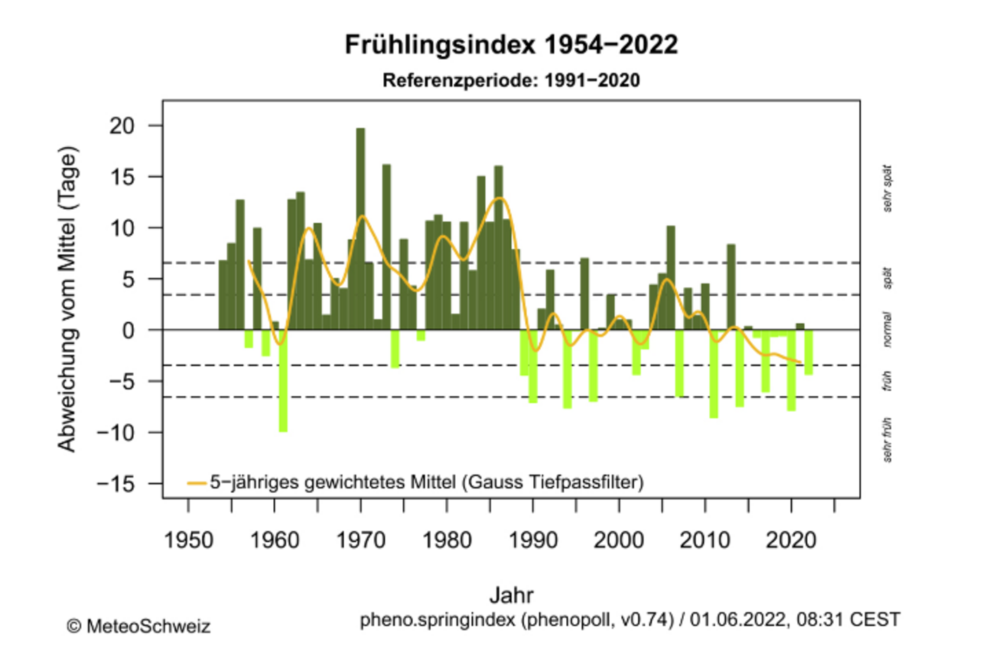 Im Jahr 2022 entwickelte sich der Frühling um 4 Tage früher als im langjährigen Mittel von 1991 bis 2020. Die Obstbäume blühten bereits Ende März mit einem Vorsprung von 5 bis 8 Tagen.