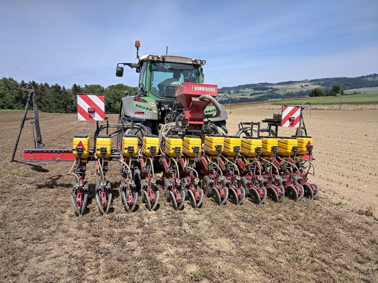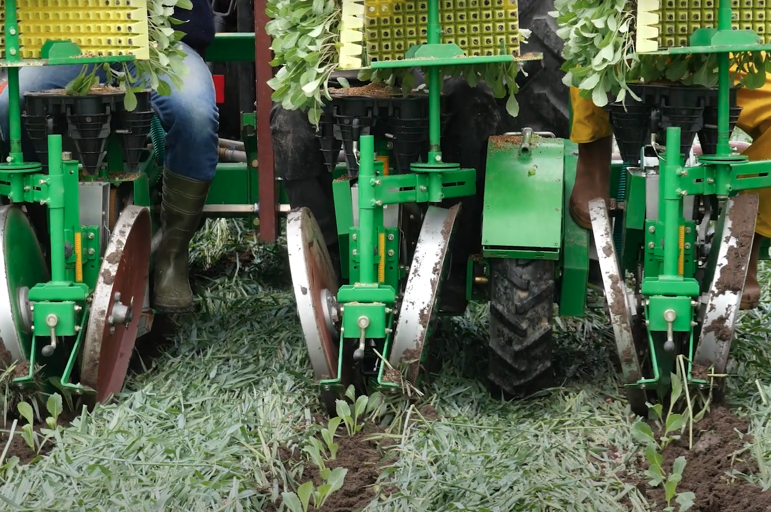 Speedy-Pflanzmaschine: Ergänzt wurde ein Düngerbehälter, um Dünger neben dem Pflanzband abzulegen. Eine zusätzliche Öffnungsscheibe bringt ihn in den Boden. Ausserdem hat man für den Konservierenden Anbau vor dem Pflanzschar eine Doppelscheibe montiert, um allfällige Ernterückstände oder Reste einer Gründüngung auf der Bodenoberfläche durchzuschneiden und so eine einwandfreie Pflanzarbeit zu ermöglichen. Über einen abgeänderten Sitz überträgt sich das Gewicht der pflanzenden Person auf das Pflanzelement, statt auf den Rahmen und hilft somit dabei, die erforderliche Tiefe einzuhalten. Eine zusätzliche, schmale Rolle an jedem Aggregat der Tiefenführungsrollen drückt die Setzlinge fest an, die zudem mit je etwa einem Deziliter Wasser versorgt werden.