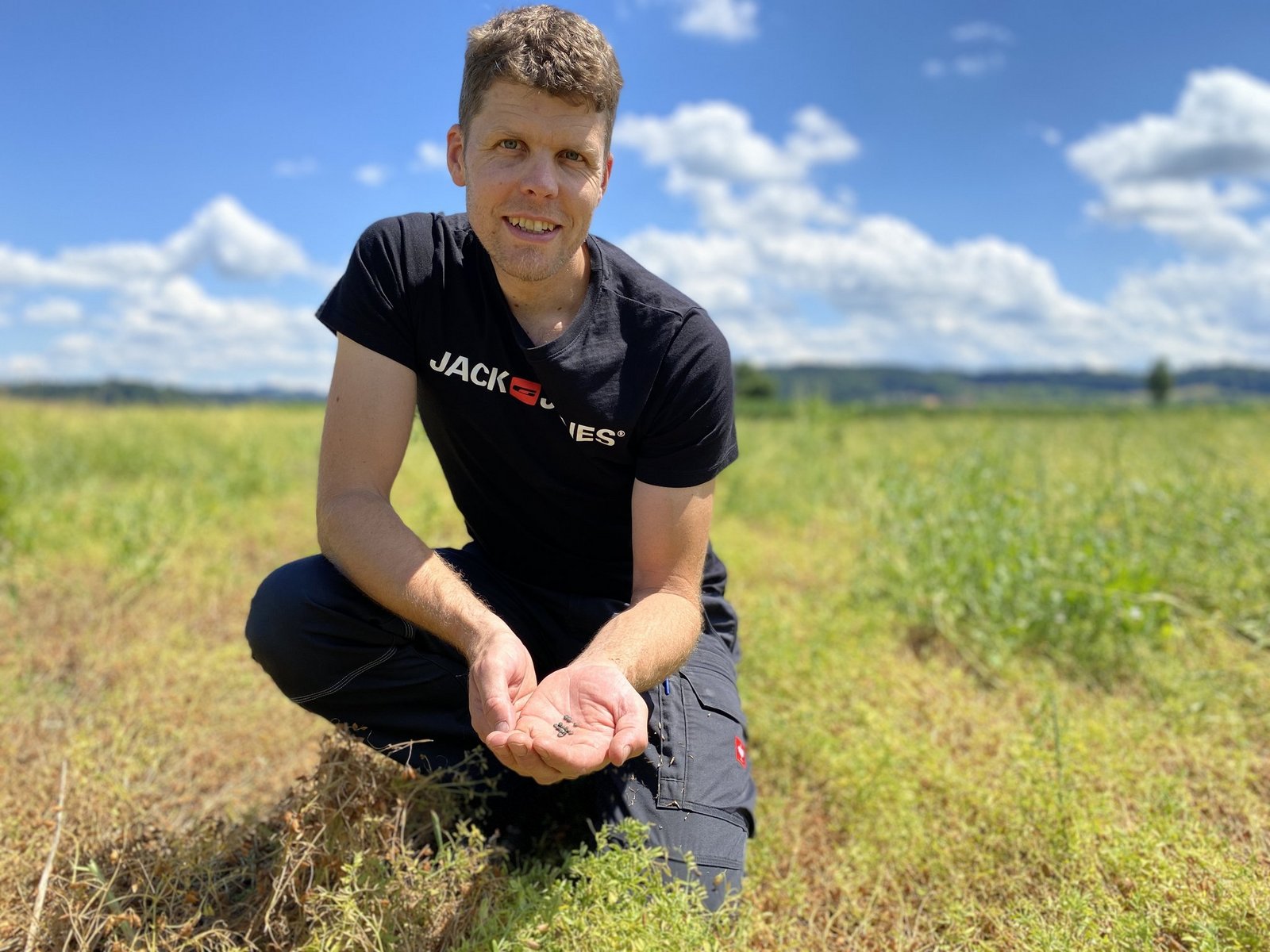 Zu den Linsen kam Simon Hauert eher zufällig: «Ich war auf der Suche nach einer neuen Kultur für meine Fruchtfolge und wollte etwas, das nicht jeder hat», erklärt er. Ein Kollege habe ihn auf Linsen hingewiesen, worauf sich der Berner ans Recherchieren machte – denn zu dieser eher unbekannten Kultur musste er sich die nötigen Informationen zusammensuchen. Die ersten beiden Jahre säte er einige Dutzend Aren, die Ernte wurde über den hofeigenen «Saisomat» und andere Hof- sowie kleine Läden in der Region vermarktet. «Ich bin wahrscheinlich der einzige Nicht-Biobauer, der Linsen anbaut», meint Hauert. Damit kommt seine Ernte zwar nicht in reine Bioläden, der Landwirt hat aber mehr Spielraum beim Anbau. So habe er sich bewusst entschieden, eine Reinsaat zu machen. «Bei Bio ist man mehr auf eine Misch- bzw. Stützkultur angewiesen, um das Unkraut zu unterdrücken.»