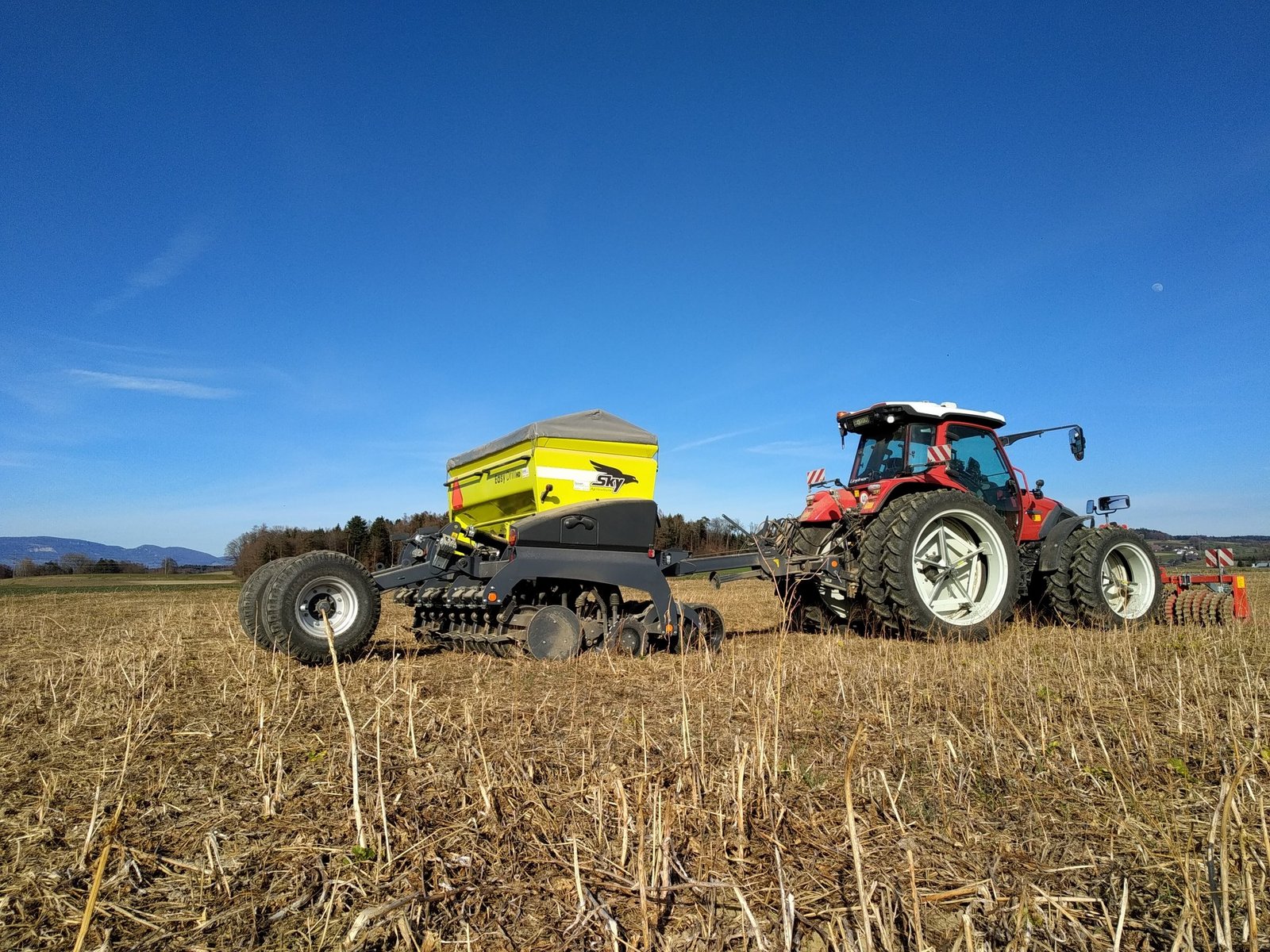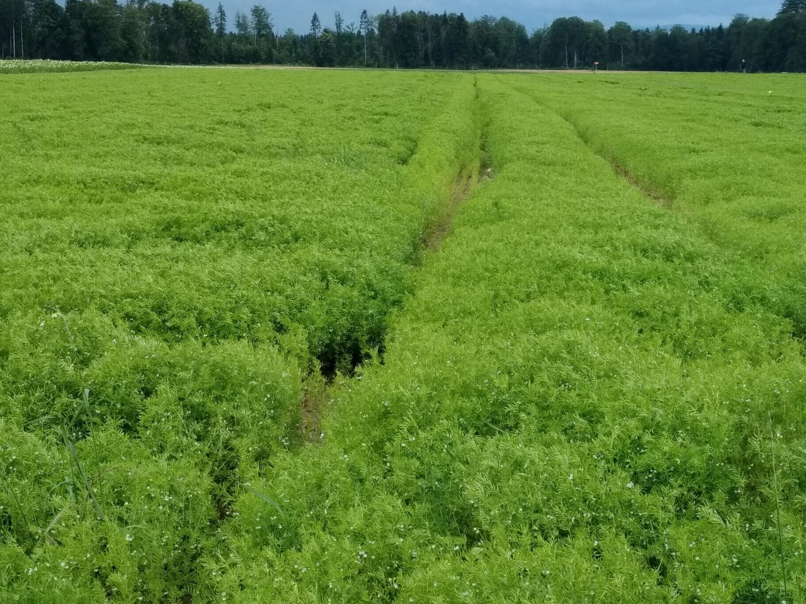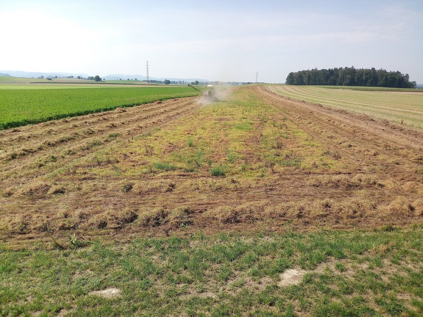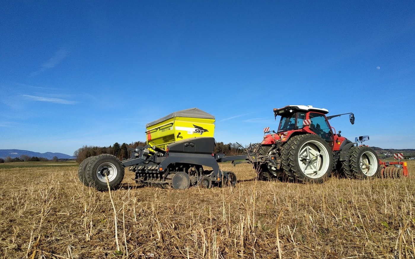 Dieses Jahr hat Simon Hauert Mitte März drei Hektaren Linsen in eine abgefrorene Gründüngung gesät. «Damit die Gründüngung trotz der schwachen Fröste eingeht, habe ich sie frostgewalzt», schildert er. Das Unkraut hielt er mit einem Vorauflaufherbizid in Schach, was für reines Erntegut wichtig ist. «Auf diese Weise muss ich nicht mit einem Striegel durch, wenn die Pflanzen noch sehr schwach sind, spare Treibstoff und Überfahrten», so seine Begründung. Schnecken seien ein Thema gewesen, wohl wegen der Überreste der Gründüngung. Zwar liefen die Linsen gut auf, allerdings erwies sich der Ölrettich aus der Gründüngung als sehr zäh und wuchs durch. «Ich weiss noch nicht, ob das bei der Ernte ein Problem wird», meint Hauert. Schwierigkeiten bereitete ihm bisher vor allem Klettenlabkraut, da dessen Samen kaum von reifen Linsen zu unterscheiden und daher schwer auszusortieren sind. Sein diesjähriger Versuch mit Kichererbsen als Stützkultur auf einer kleinen Fläche verlief bisher wenig erfolgreich: Wahrscheinlich werden die Kichererbsen nicht rechtzeitig ausreifen und es bräuchte eine höhere Saatdichte für eine bessere Stützfunktion.