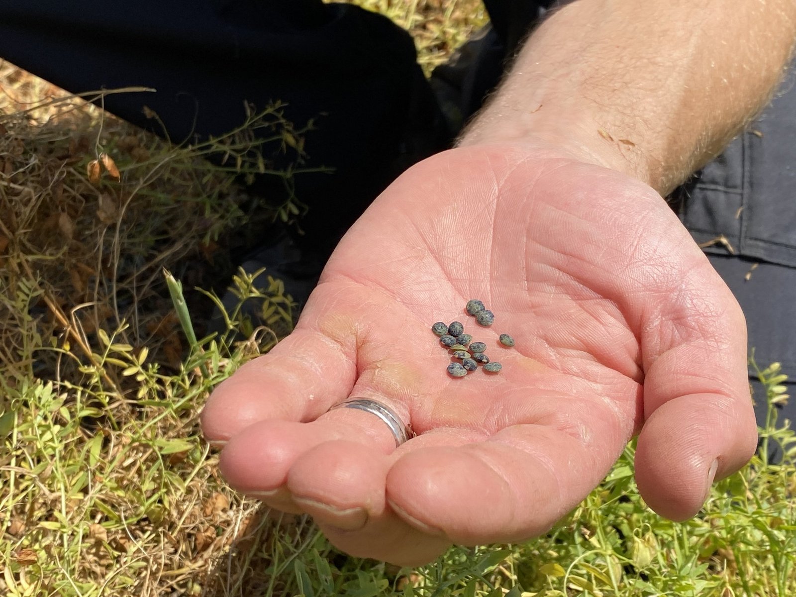 Der Starkregen Anfang Juli hat die Linsen niedergedrückt. Im unteren Teil sind die Pflanzen braun und trocken, die Körner reif. Anders sieht es weiter oben aus, wo Hülsen und Blätter noch lebendig grün schimmern. «Der Erntezeitpunkt ist sehr schwierig festzulegen», bemerkt Simon Hauert. Mit Krankheiten oder Schädlingen habe er bei den Linsen bisher kaum zu kämpfen gehabt, die Ernte aber sei eine Herausforderung: Sind die Hülsen zu trocken, gibt es viel Bruch und damit Verluste. Heuer hat der Regen bereits einige Linsen aus ihren Hülsen geschlagen, die nun ebenfalls verloren sind.
