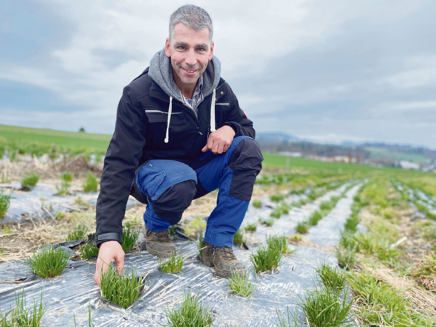 «Schnell, sonst sind alle Regenwürmer wieder weg», meint Stefan Eichholzer scherzhaft. Gerade hat er ein Grasbüschel am Rand der schwarzen Bahn aus Mulchfolie ausgerissen, um den Boden des Feldes für ein Foto zu freizulegen. Die Erde ist krümelig, von feinen Wurzeln durchzogen und Regenwürmer verschiedener Grösse sind darin unterwegs. Fruchtbar sieht das aus, und der Schnittlauch – der hier auf der Parzelle die…