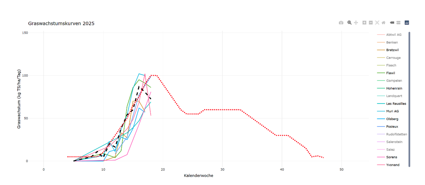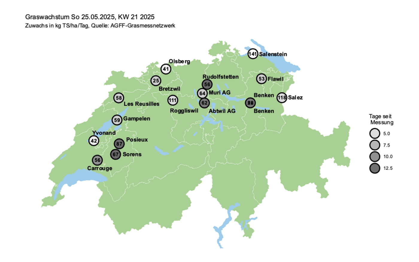 Nach der Wachstumsspitze folgt Ende Mai die Bestockungskrise. Im Grasmessnetz der AGFF wurden für die letzte Maiwoche verbreitet Wachstumsraten unter 70 kg TS/ha gemeldet. Dieser Rückgang ist in der Phase der Bestockungskrise normal: die Gräser bilden Ähren und Rispen, das Blattwachstum wird reduziert. Wenig Sonne und tiefere Temperaturen verstärken diesen Effekt. Für die kommende Woche ist mit einem ähnlichen Graswachstum zu rechnen. Deshalb sollten jetzt die Weideflächen vergrössert werden, um die Grashöhe im optimalen Bereich zu halten.