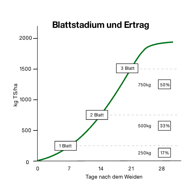 Bei guten Bedingungen bildet das Gras etwa ein neues Blatt pro Woche. Bei einer Umtriebsdauer von 21 Tagen entstehen so drei neue Blätter – rund die Hälfte des Ertrags entsteht in der dritten Woche.