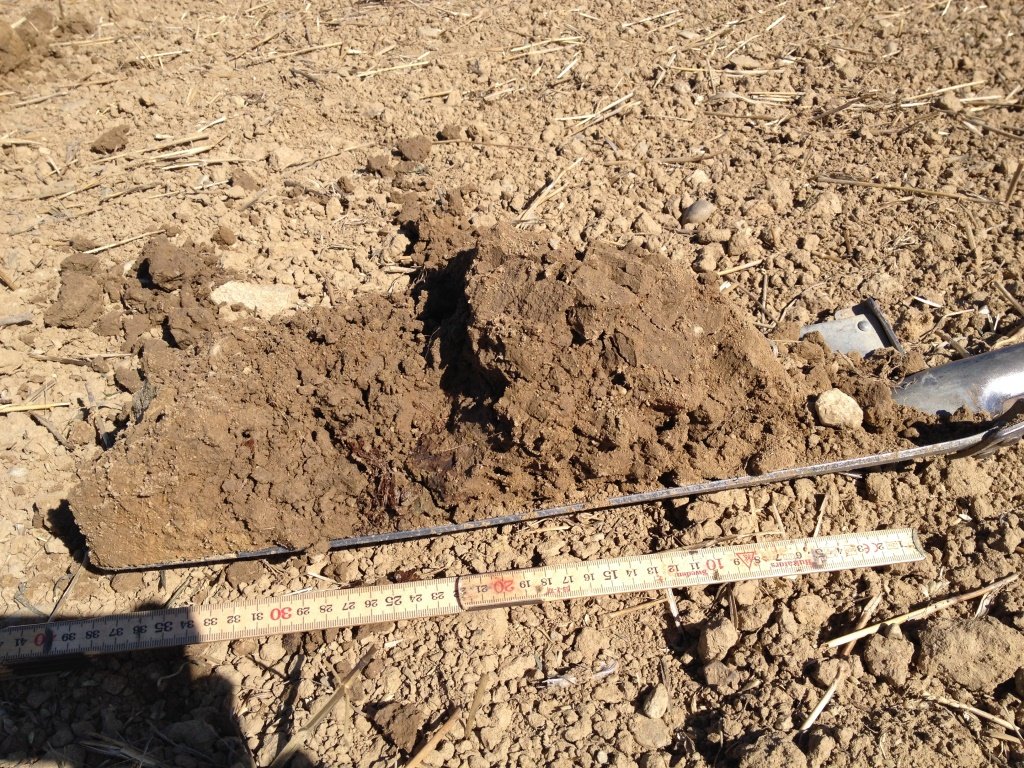 Etwas tiefer schaut man mit einem Teleskopprofil. Dabei wird mit der Palettgabel in einem Winkel von 30-45 Grad ein dreieckiges Stück Erde aus dem Feld gestochen. In diesen obersten 50-60 Zentimetern zeigen sich die Durchwurzelung und die Klumpengrösse. Je kleiner die Klumpen und je ungehinderter sich die Wurzeln ihren Weg nach unten bahnen können, desto besser. Regenwurmgänge zeigen die Aktivität dieser Bodenverbesserer und ein paar Tropfen Salzsäure (Vorsicht ätzend) den Kalkgehalt des Bodens.