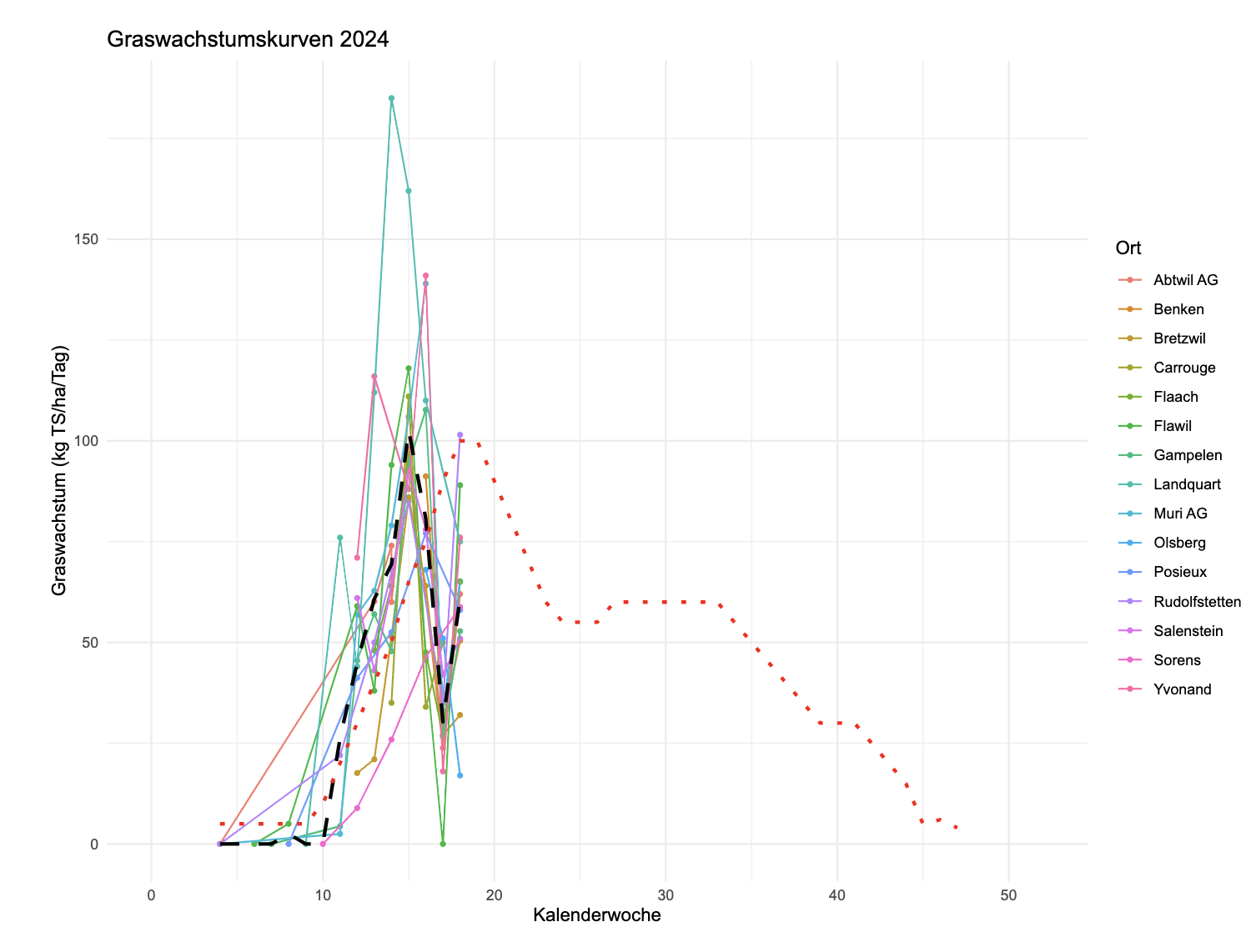 Die gemeldeten Graswachstumsraten dieser Woche liegen mit durchschnittlich rund 60 kg TS/ha/Tag eher an der unteren Grenze für diese Jahreszeit. Mit Höchsttemperaturen um die 15 °C ist nächste Woche ein Wachstum im ähnlichen Rahmen zu erwartet. Ältere Bestände kommen jetzt zügig ins Rispenschieben, die Verholzung nimmt zu: Solche Weideflächen sollten möglichst übersprungen werden.