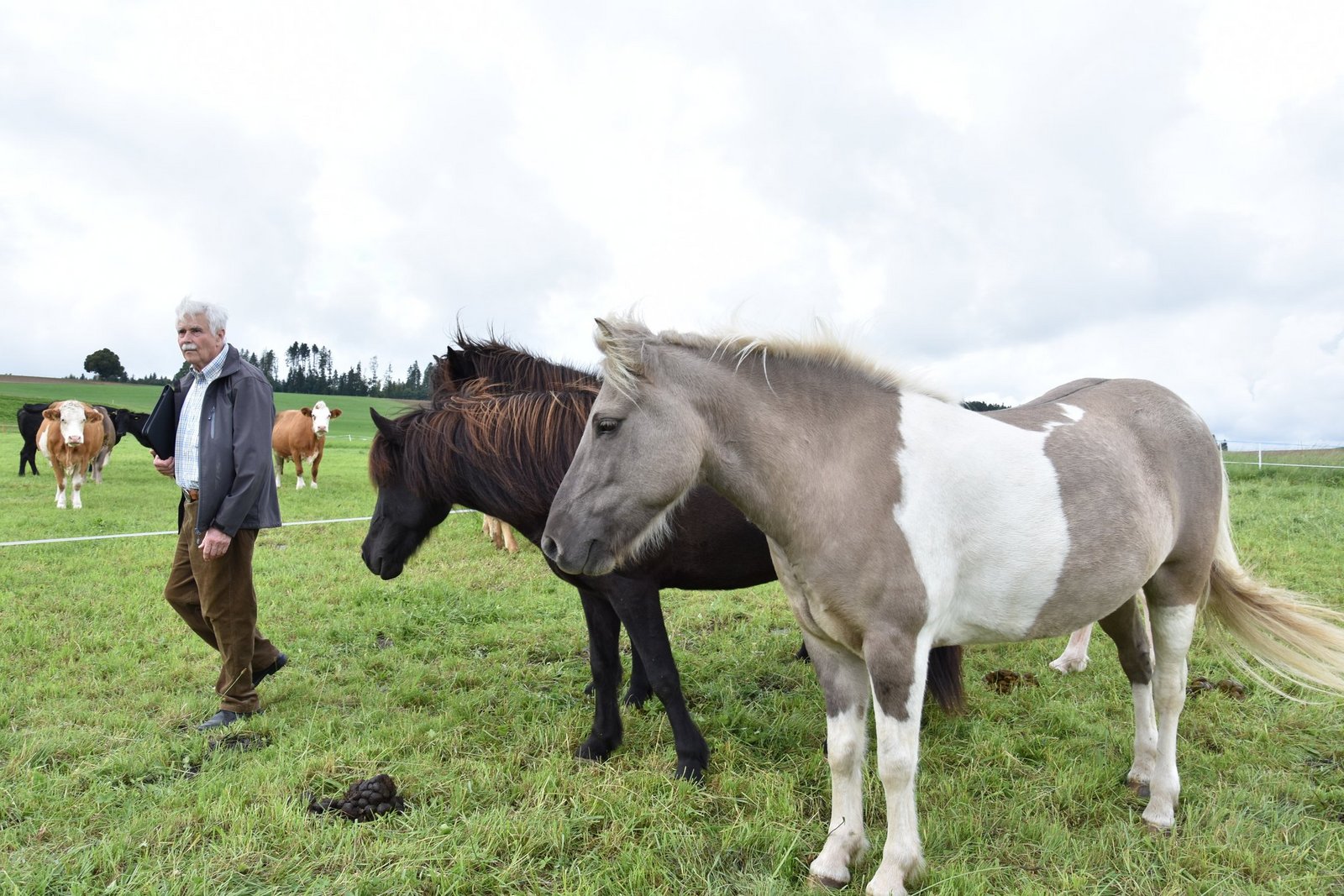 Astrid Michel hält im kleinen Dorf Zimmerwald im Kanton Bern vier Islandpferde. Überall hängen Kleber mit der Aufschrift «Islandpferdehof Wald». «Meine Schwägerin hat das Sujet entworfen, darum sind wir so gut angeschrieben», scherzt die Tierärztin. Drei Hektaren Weide und gut 200 m2 Fläche umfasst der Islandpferde-Offenstall, zu dem auch eine bunt gemischte Mutterkuhherde gehört. Die Pferde teilen die Weide sogar mit den Kühen. «Die Pferde ziehen der Kuhherde hinterher, das ist eine optimale Weidepflege», beobachtet Astrid Michel und zeigt den zwei Experten stolz ihre kleine Herde.