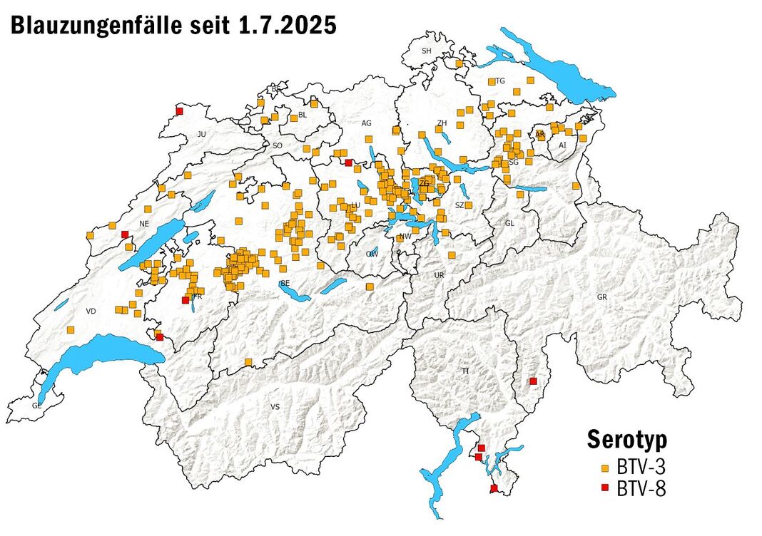 Länger schien es nun etwas ruhiger um die Blauzungenkrankheit zu sein. Doch seit Mitte Juli steigt die Anzahl der gemeldeten Fälle erneut an. Während von Anfang Mai bis Mitte Juni laut Monitoring des Bundesamtes für Lebensmittelsicherheit und Veterinärwesen (BLV) 70 neue Fälle gemeldet wurden, haben sich diese mit 267 Fällen seither fast vervierfacht.