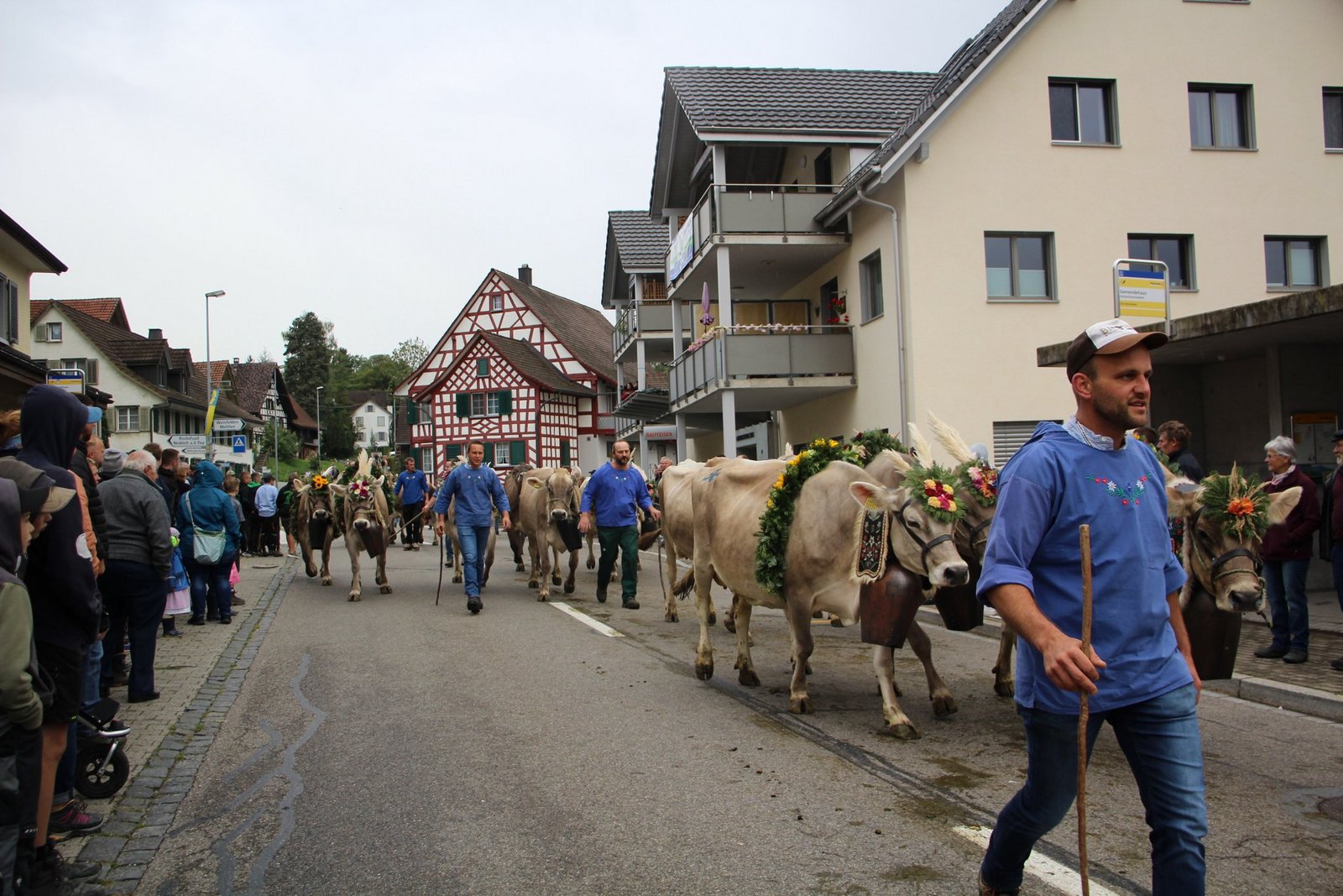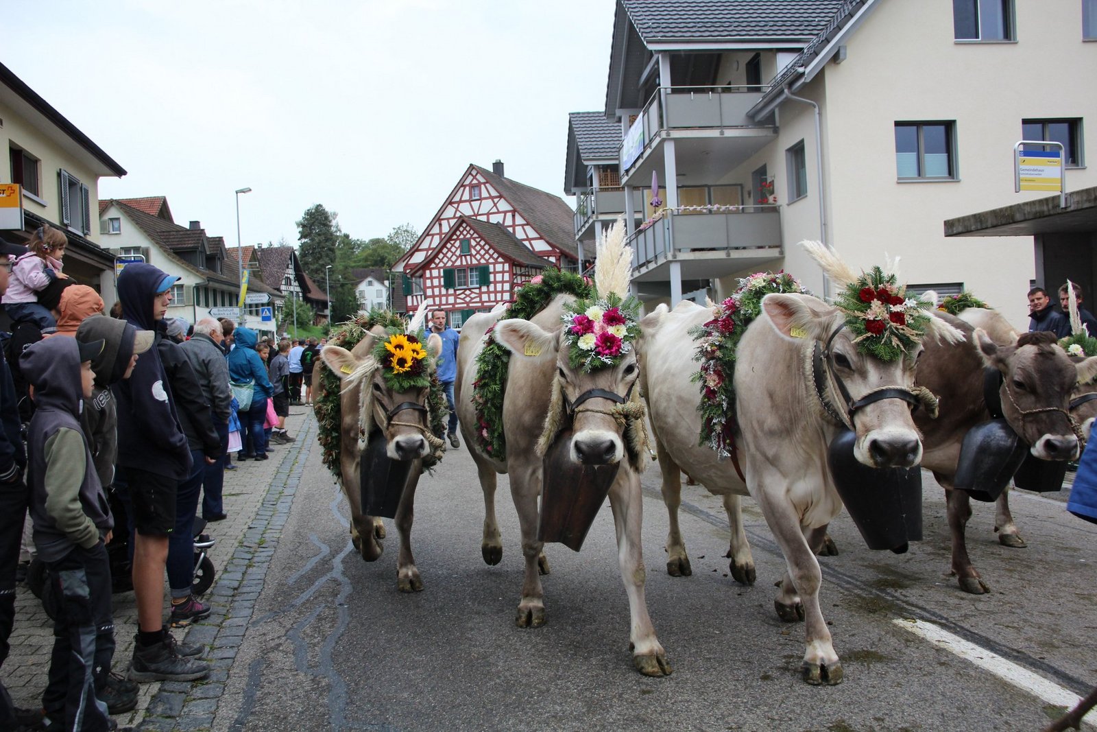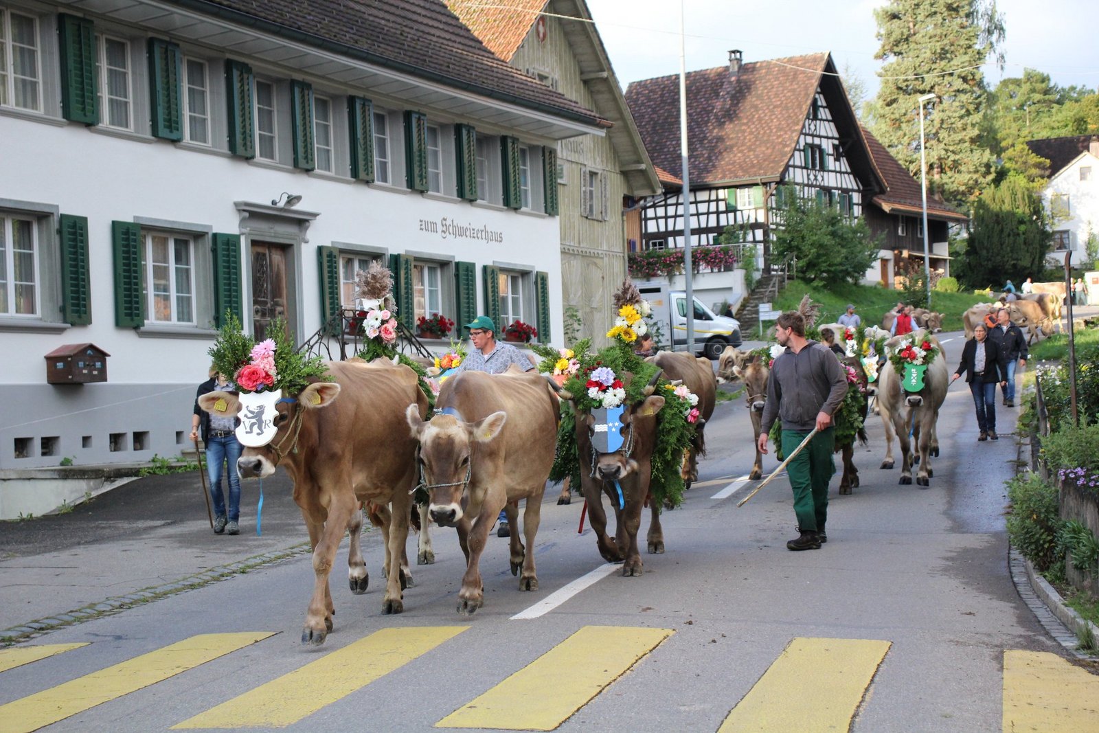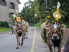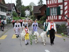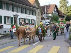 Glockengebimmel und Muhen kündigte schon von weitem die ersten Gruppen an. Vom Nollen, vom Hosenruck, aus Istighofen, Wuppenau, Heiligkreuz und natürlich aus Schönholzerswilen kamen die 20 Gruppen mit festlich herausgeputzten und geschmückten Tieren, mit Bauern, Bäuerinnen und Kindern, nicht minder herausgeputzt mit Blumen in den zu Zöpfen geflochtenen Haaren und in Festtagstrachten gekleidet.
