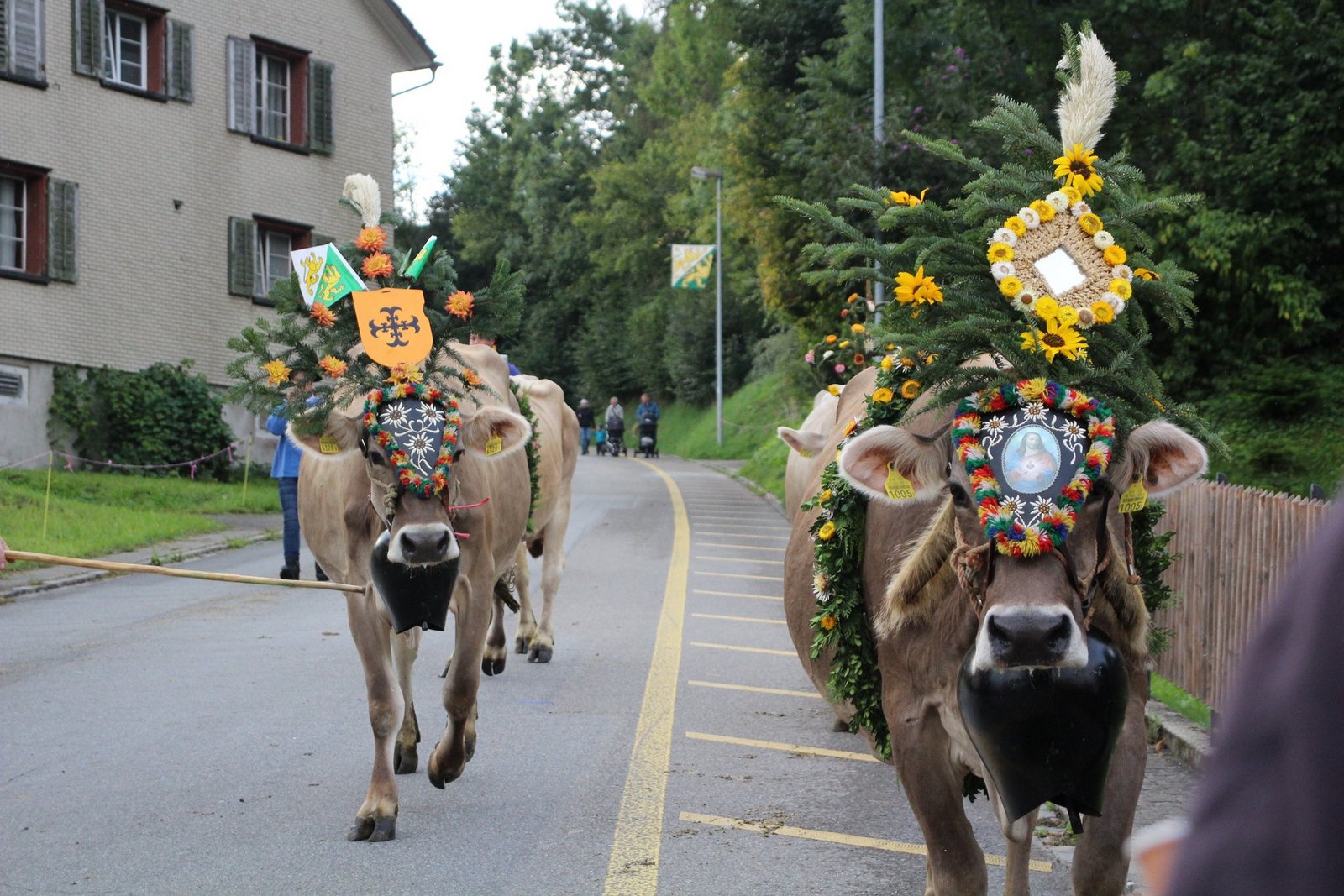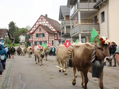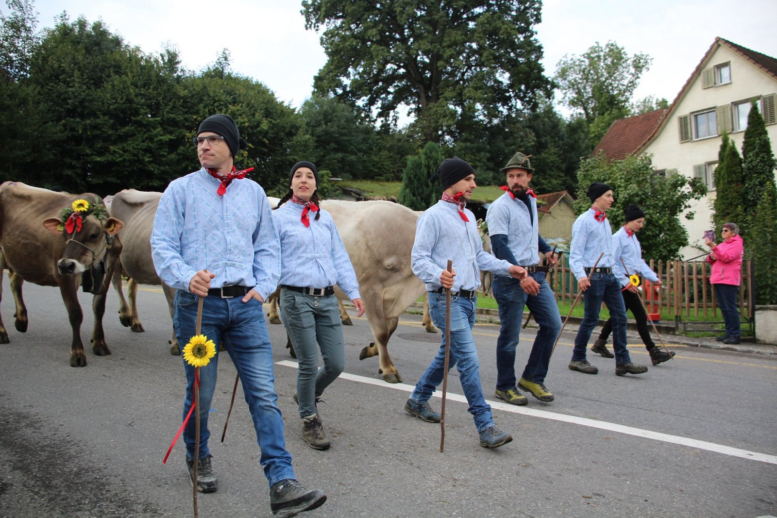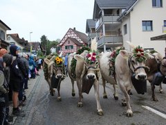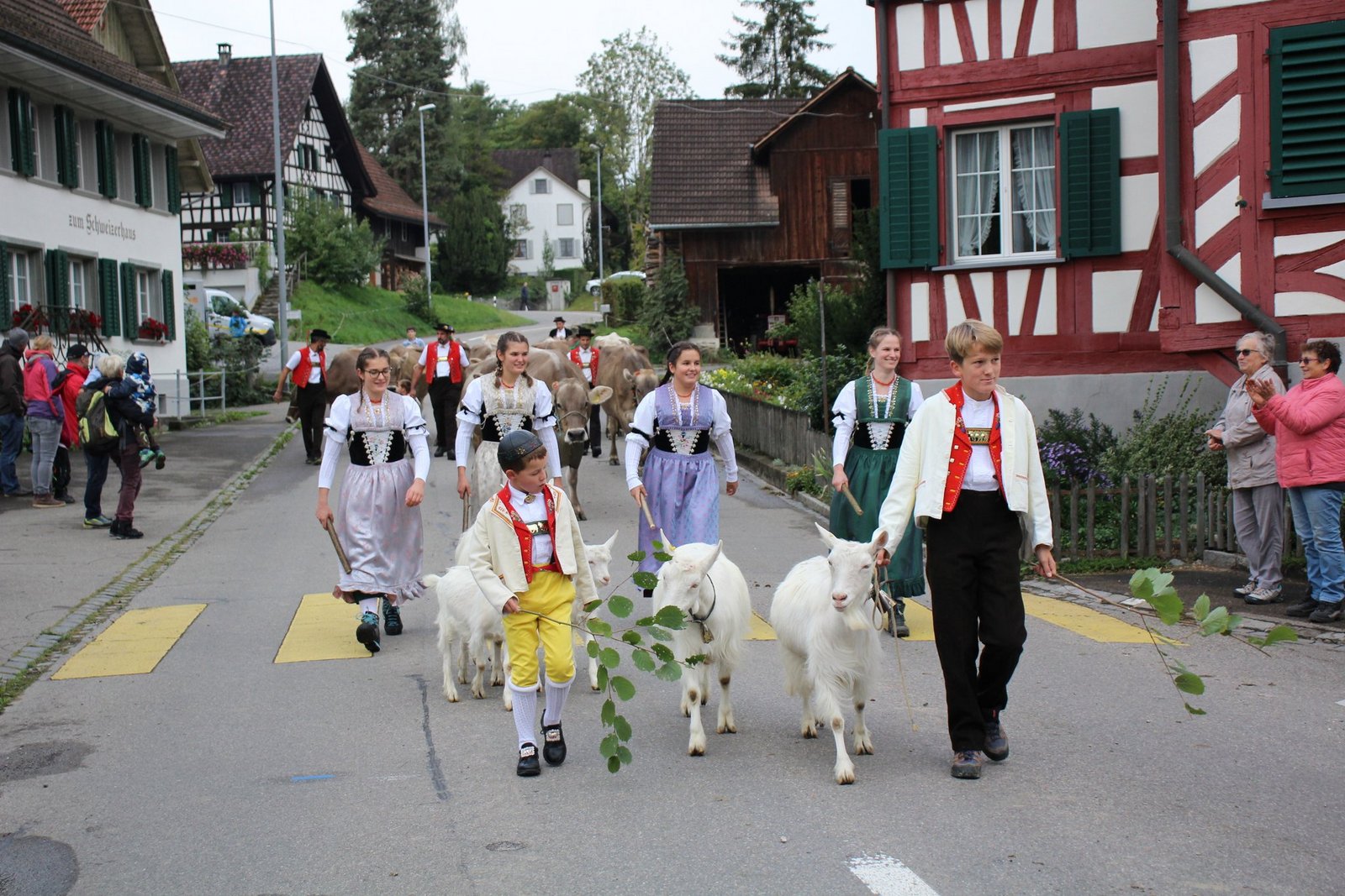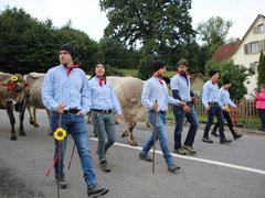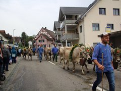 Auch Appenzeller Bauernfamilien leben in der Gegend und kamen traditionell daher mit Geissen, Geissbuben und -mädchen voraus. Die vier Sennen hinter den Schellenkühen gaben mit Zäuerli und Juchzer ihrer Freude Ausdruck, wie es sich gehört.