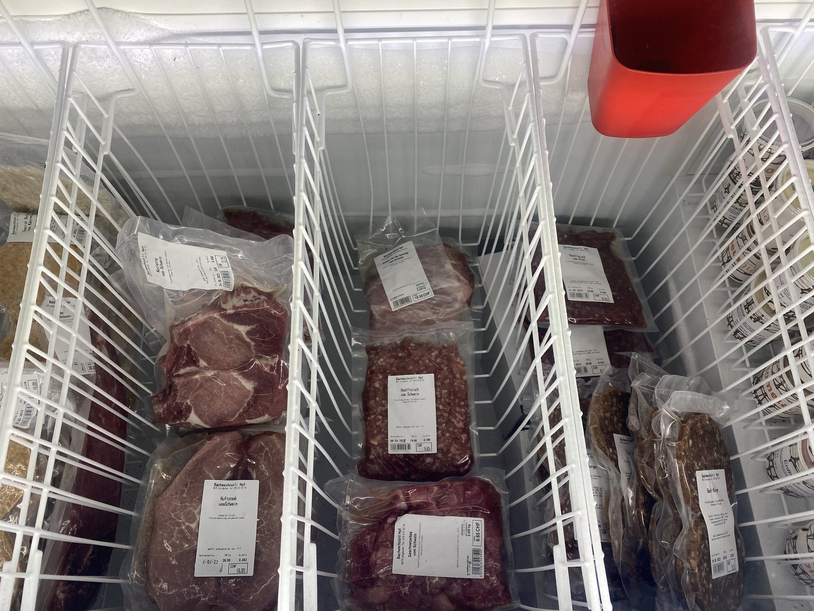 Neben der auffälligen Fellzeichnung und ihrer Feinfühligkeit zeichnet sich die Südtiroler Rinderrasse durch spezielles Fleisch aus. «Es ist butterzart, eiweissreich, cholesterinarm und mit Fett schön durchzogen», so die Beschreibung von Monica Graf. Bevor sie und ihr Mann die ersten Pustertaler Sprinzen gekauft haben, bestand die Thurgauerin darauf, solches Fleisch selbst zuzubereiten. Das Ergebnis überzeugte sie davon, dass es sich bei diesem Produkt um etwas Besonderes handelt. Daher verkaufen Grafs Würste, frisches und tiefgefrorenes Fleisch der männlichen Pustertaler Sprinzen auf dem Bacheschüürli ausschliesslich im Hofladen – auch wenn die Direktvermarktung wegen des grossen Aufwands für sie nicht rentabler sei, als der Verkauf der Grauvieh-Kälber als Natura-Veal. Das Pustertaler-Fleisch gehöre aber nicht in den Detailhandel, wo es nicht als Spezialität wahrgenommen wird.