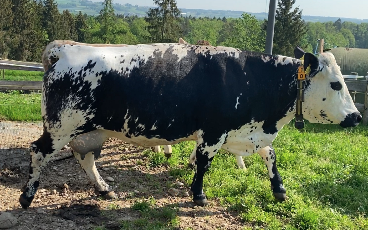 Beiläufig zupft Monica Graf ein paar Strohhalme vom Bauch der schwarz-weissen Mutterkuh vor ihr. Die Zeichnung auf ihrem gefleckten Fell ist auf beiden Körperseiten symmetrisch und macht schnell klar, dass es sich hier um einen nicht alltäglichen Anblick handelt. «Es gibt aktuell in der Schweiz gesamthaft 55 Pustertaler Sprinzen, davon 47 weibliche», erklärt Graf. Ihre Tiere waren unter den ersten, die importiert worden sind.