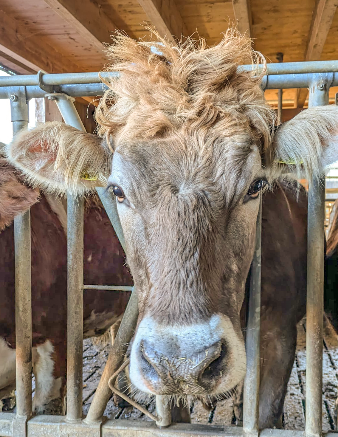 Seither lebt sie auf dem aargauischen Betrieb und fühlt sich offensichtlich wohl. «Lina ist eine zahme und zutrauliche Kuh und hört hin, wenn man ihr ruft», so Jan Lüscher. Aufgrund ihrer aussergewöhnlichen Haarpracht auf dem Kopf hat ihr der Landwirt sogar einen Spitznamen gegeben. Ein 10 Zentimeter langes Haarbüschel schmücke ihren Kopf. «Man könnte Lockenwickler hineinstecken», witzelt der Aargauer. [IMG 2, 3]