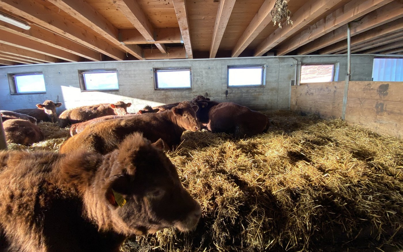 Manche 10-jährige Kuh sei bei ihm noch nie in einem Klauenbehandlungsstand gelandet, sagt Andreas Moor nicht ohne Stolz. Er führt das einerseits auf die robuste Rasse zurück, andererseits auch auf sein Stallsystem: Die Tiere liegen auf dicken Matratzen aus Tretmist. «Ich habe andere Ställe besucht und bei Liegeboxen standen die Kühe im Feuchten», schildert er. in seinem eigenen Stall ist der Liegebereich zum Stallgang hin leicht abschüssig, so arbeiten die Kühe das Material langsam nach vorne und Moor füllt wandseitig frisches Stroh nach. «Ich muss zwar grössere Mengen Stroh zukaufen. Dafür spare ich die Kosten für kranke Klauen, weil sie nicht aufweichen», ist der Landwirt überzeugt.