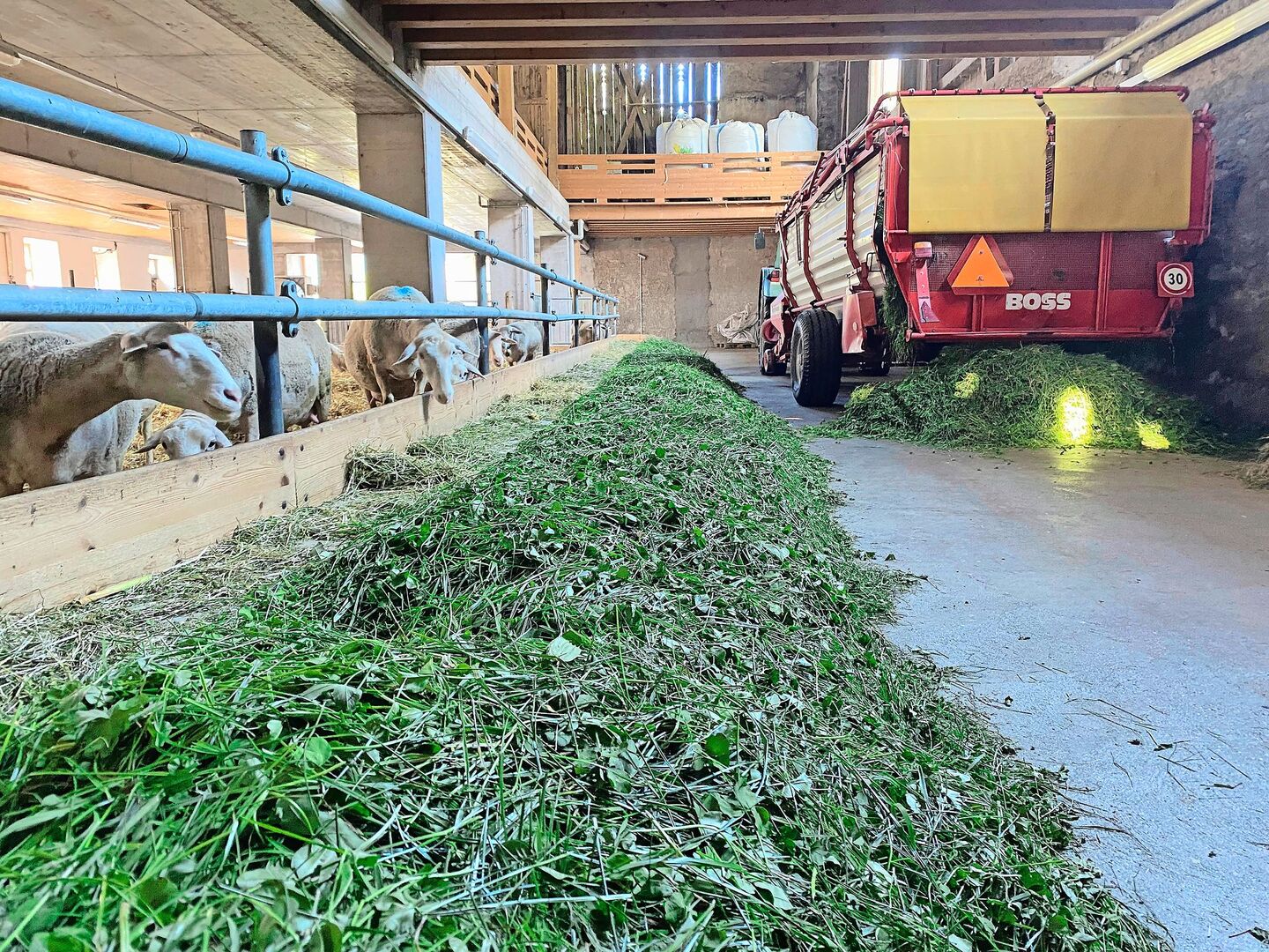 Nasses Gras ist aufzubewahren, weil es schnell warm wird. Wir verteilen das Futter immer gut im Stallgang, damit es nicht schlecht wird und wir das Gras einen Tag lagern können. Zu warmes Wetter ist jedoch auch nicht gut, denn dort wird das Gras auch warm. Und es fängt an, zu müffeln.
