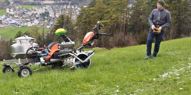 Lohnunternehmer André Troxler zieht im steilen Gelände Übersaaten vor