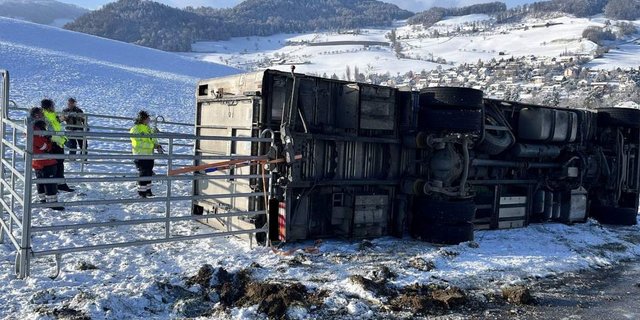 Ein Tiertransporter ist bei einem Selbstunfall auf die Seite gekippt – Strassensperre