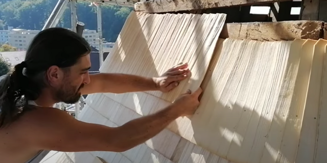 Ein Schindelmacher zeigt, wie er Holzschindeln verlegt