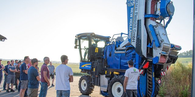 Eine grosse Maschine erntet kleine Trauben am Schaffhauser Sommerhöck